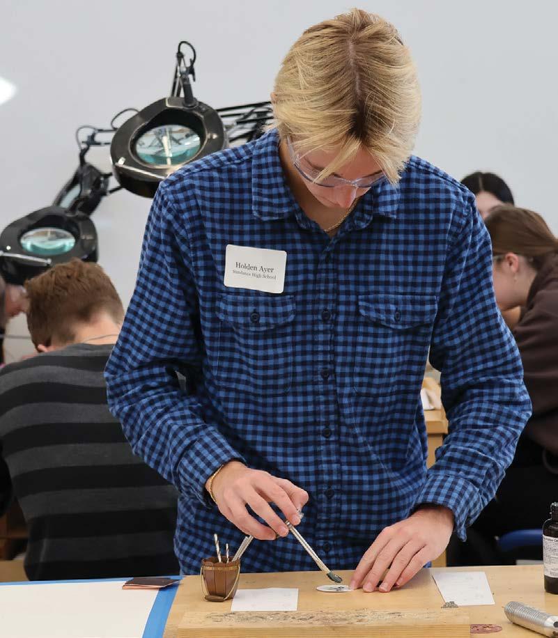 For more than two decades, the Department of Visual Arts has offered annual hands-on art intensives for Wyoming high school students. In 2024, more than 200 students representing 20 Wyoming high schools participated in two days of workshops on the UW Laramie campus. Workshops encompassed a broad range of visual arts disciplines and techniques – including drawing, painting, printmaking, ceramics, art history, photography, metalsmithing, and sculpture – were led by 18 visual arts faculty. The intensive was supported by more than 40 UW student assistants, who gained applied experience contributing to their professional development.