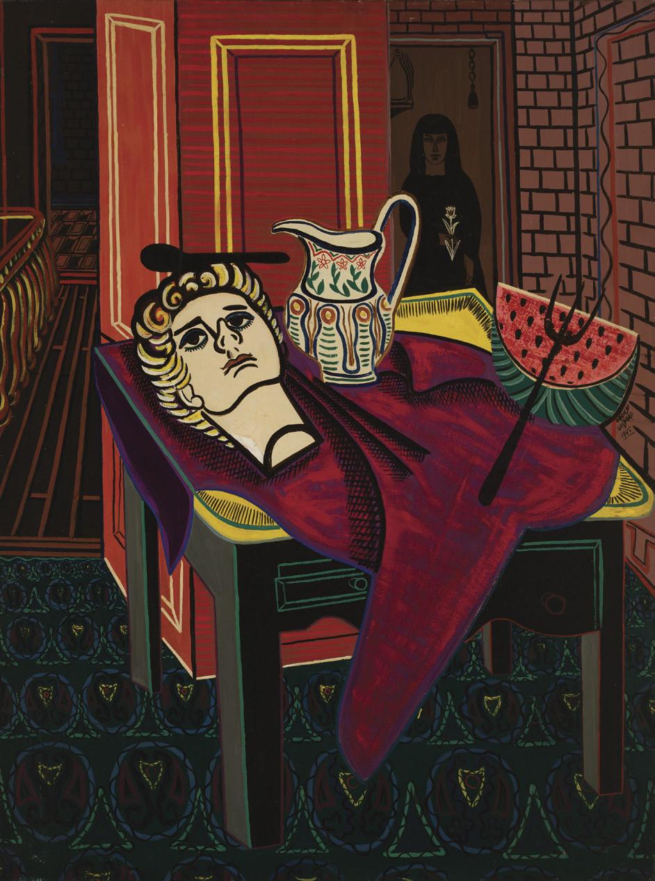 UW student Arthur Canaday, of Bakersfield, Calif., works on a creative project seated before a large painting by Neltje at her Sheridan County studio.