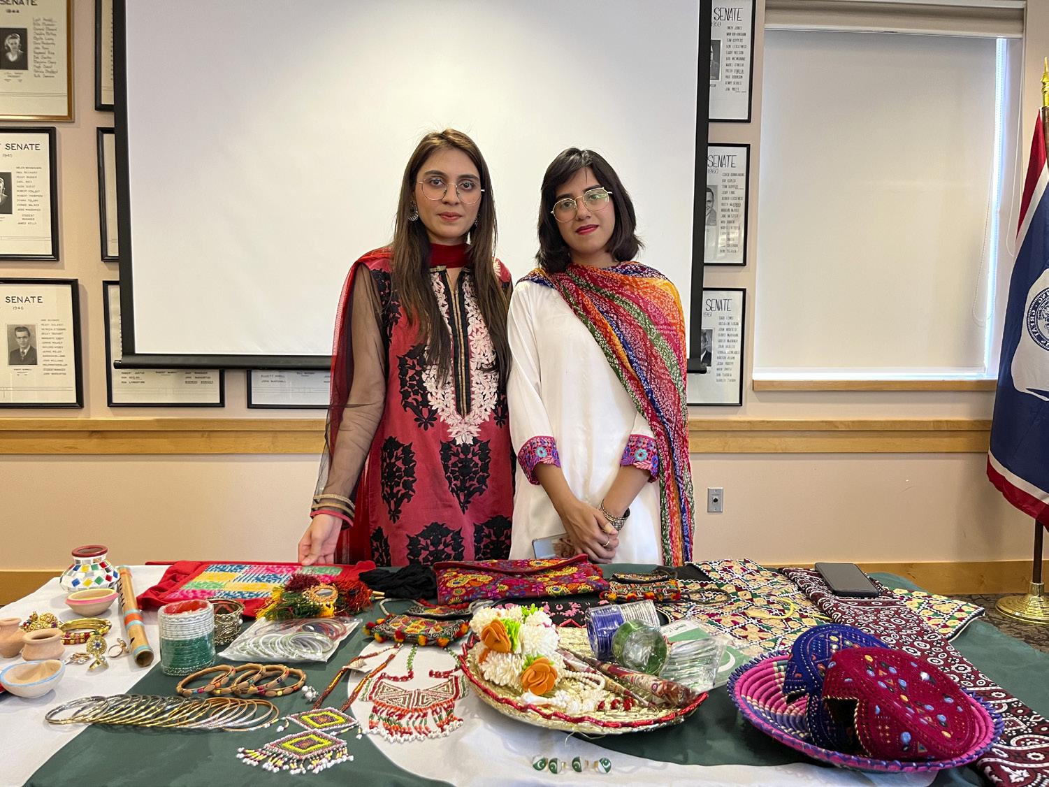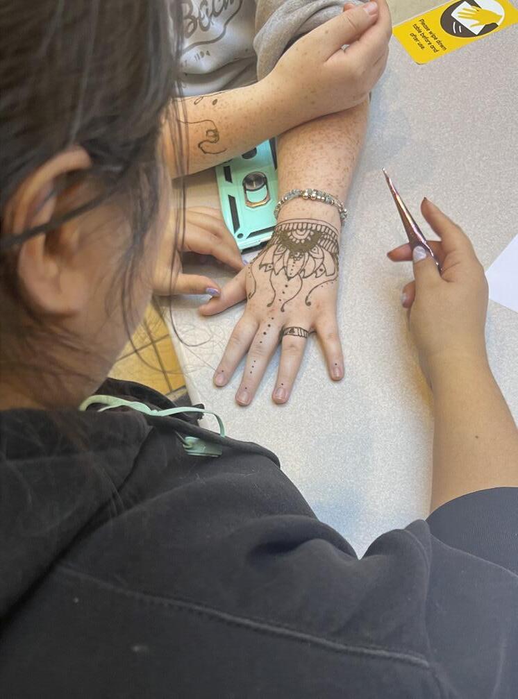 International Education Week takes place each November with a variety of fun events. Pictured clockwise from top: Students Mishal Aslam and Shifa Ijaz after their presentation on Pakistan; students practice the art of henna; students at the Central Asian traditional dance event.