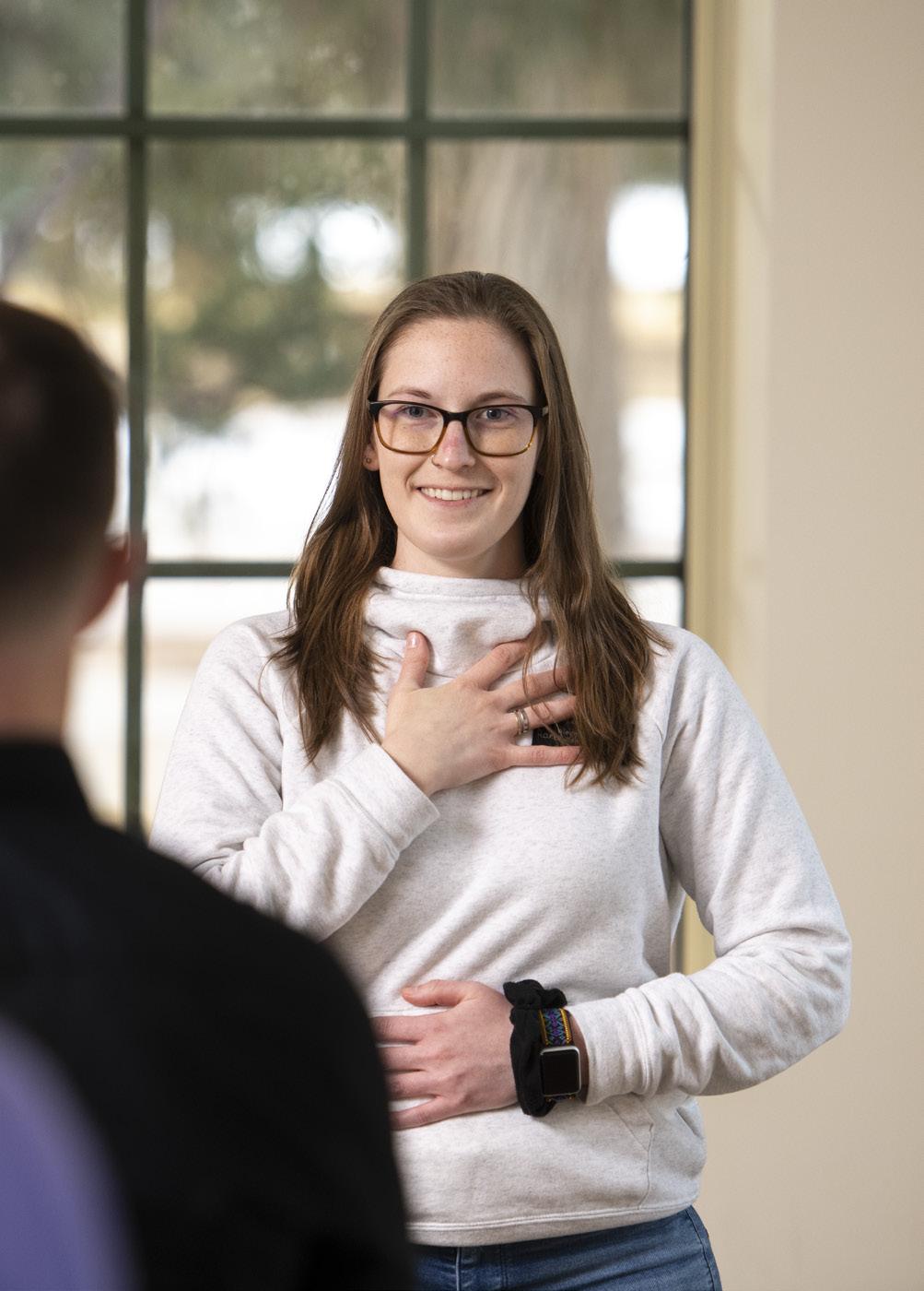 “The biggest challenge I have faced in college is the feeling of defeat and selfdoubt,” says Cowboy Coach Karissa Kiser, a junior from Littleton, Colo., studying physiology (professional writing minor). “This can come in so many ways, such as getting a bad score on an exam, seeing your peers having an easier time than you, or just feeling mentally and emotionally exhausted from everything that is going on in multiple difficult classes. The feeling of defeat used to weigh down on me so much, and I would start to let it deplete my confidence in myself and began to doubt my ability to achieve my goals or be as good as my peers.”
