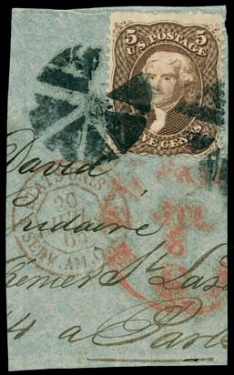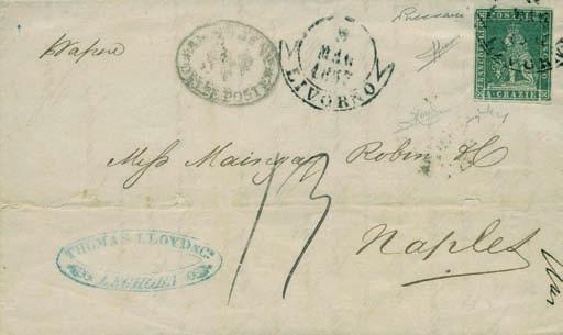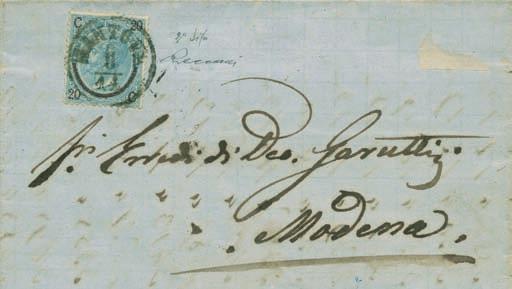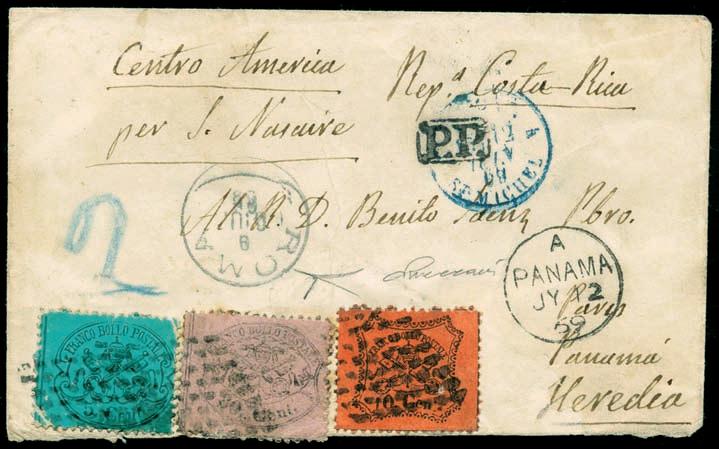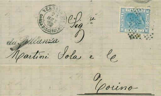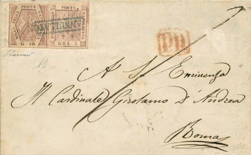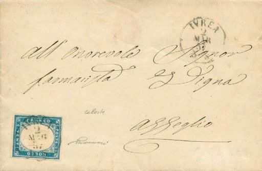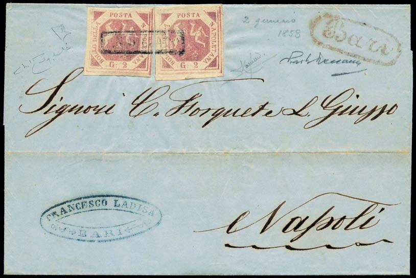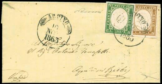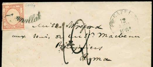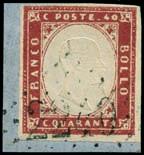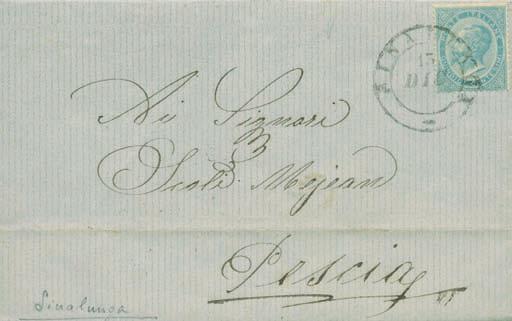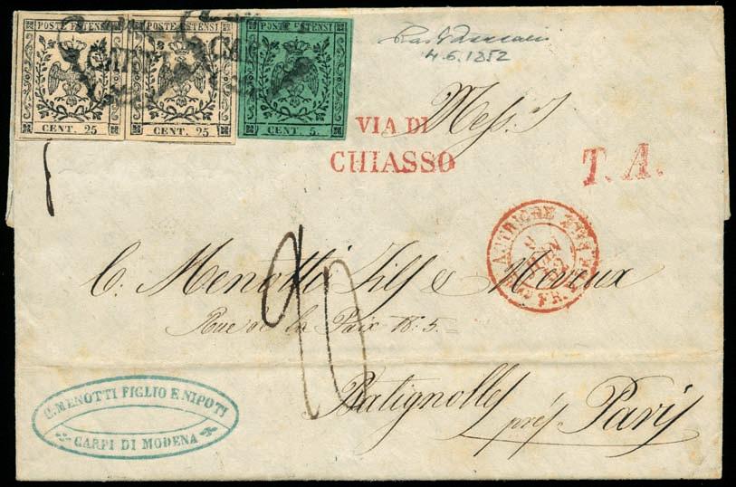 Lettera spedita da Carrara a Filadelfia (USA) il 2 agosto 1857 con tassa manoscritta “3” in quanto inoltrata per la via di Sarzana a Genova, dove giunse il 4 agosto 1857, e da qui a Filadelfia tramite un piroscafo postale francese. Il bollo “SARDAIGNE - CULOZ” e la tassa “21” a tampone ne sono la testimonianza, come anche il bollo al verso “PARIS A CALAIS”. La lettera è affrancata per lire 1,40 con 1 lira bianco + cent.40 azzurro scuro. La tariffa è rara per la corrispondenza Vito Viti di Filadelfia, e venne utilizzata con porto a destino (bollo “P.D.”), dal 1° maggio 1857 al 31 ottobre 1858. Sia la lettera (con testo) sia i francobolli sono di ottima qualità!