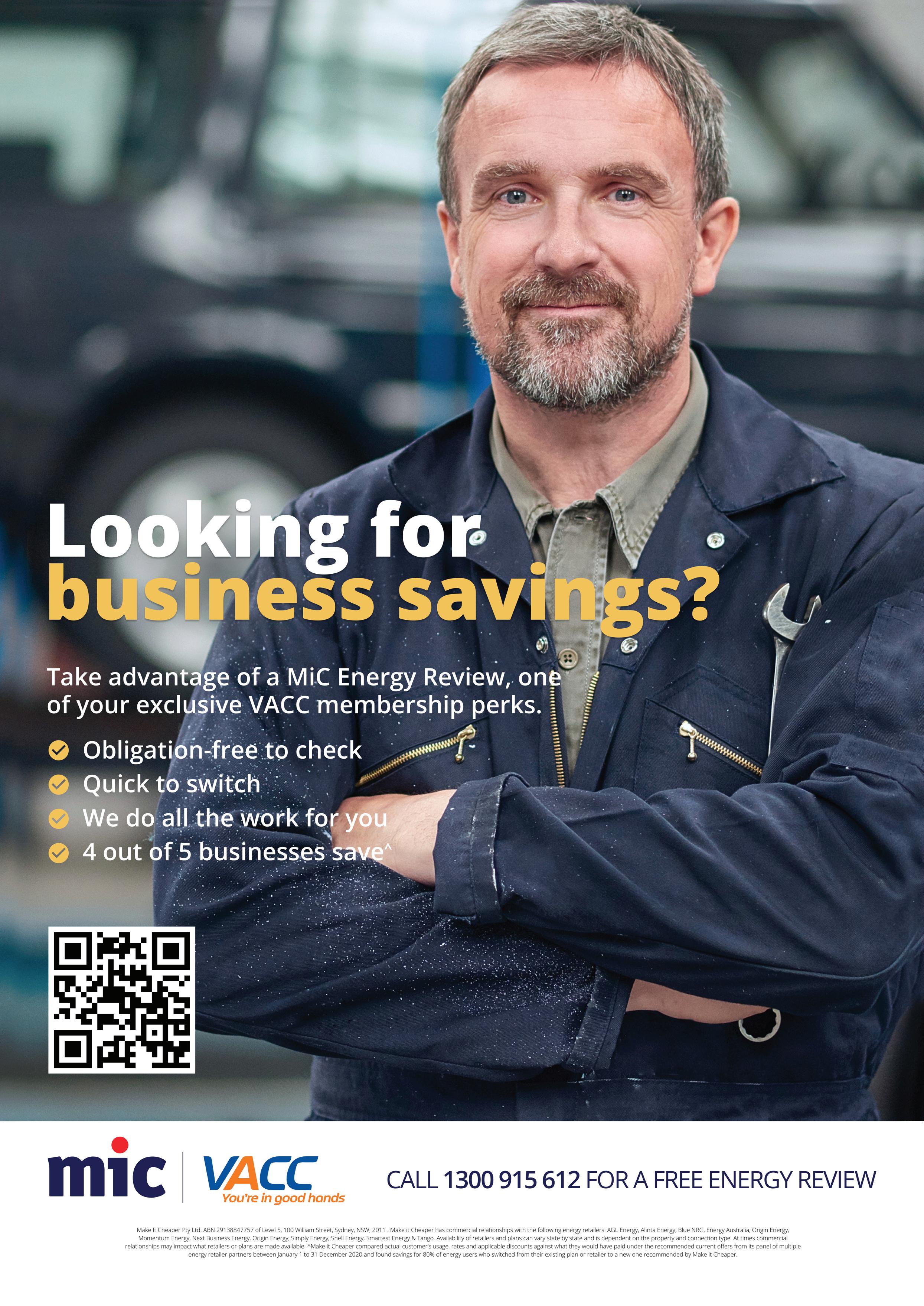 MiC is the leading energy price comparison service for Australian businesses. VACC and TACC members have access to a free energy bill review. Then MiC works with leading retailers to find a competitive deal.