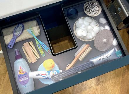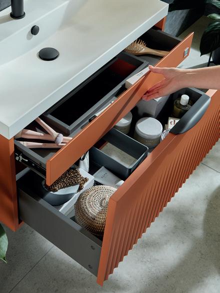 Printed inserts for top drawers, styled with everyday items to show real-life use. Swatches showcasing the full range of furniture colours and finishes, designed to help customers explore the collection.