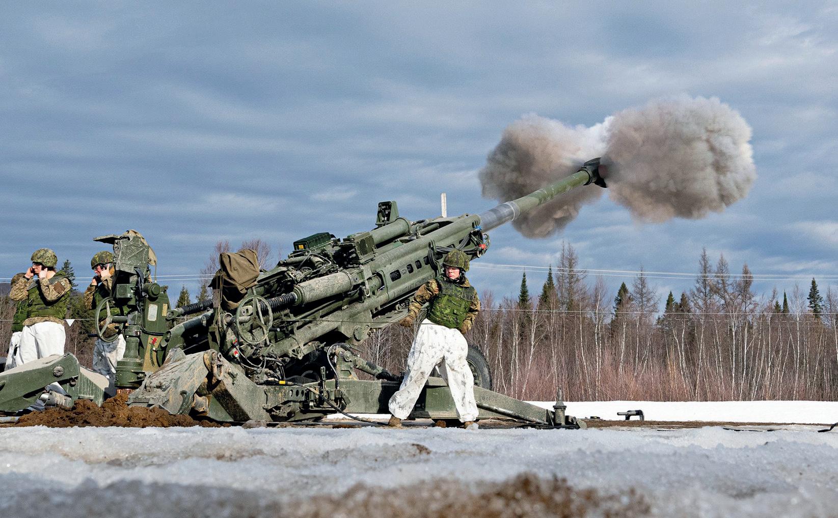 A member of the 5 RALC fires an M777 howitzer during Exercise PIÈCES GELÉES