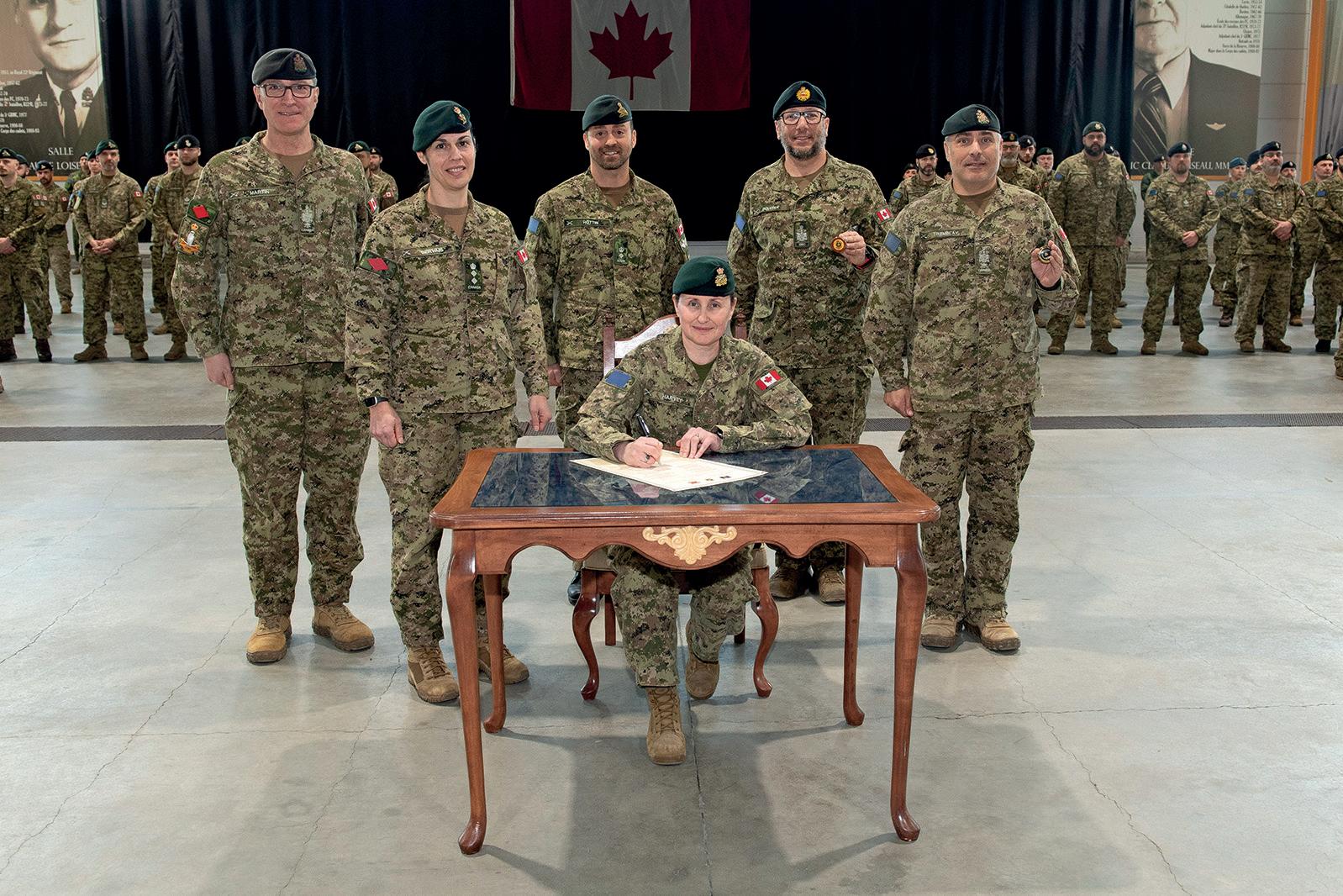 Signature du parchemin officialisant le transfert d’autorité du commandement. De gauche à droite : l’adjudant Martin, sergent-major, Collège de commandement et d'état-major, la colonelle Gervais, chef d’état-major et représentante du CDIAC, le lieutenant-colonel Hottin, commandant du CIA-Est, la brigadière-générale Harvey, commandante de la 2 Div CA, l’adjudant Boucher, sergent-major du CIA-Est, et l’adjudant Tremblay, sergent-major de la 2 Div CA.