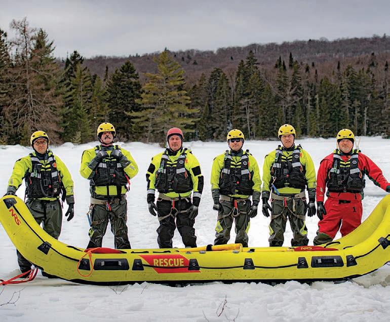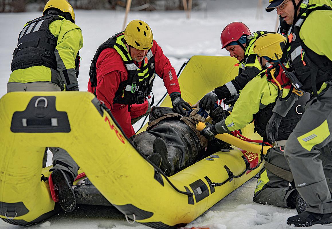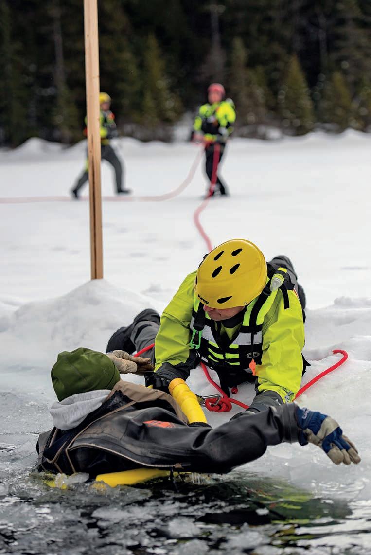 Un pompier de la municipalité de Saint-Gabrielde-Valcartier procède au sauvetage d’une victime fictive, l’adjudant Dion-Tessier, membre des CTSE, tombée dans une eau glacée. A firefighter from the municipality of Saint-Gabriel-de-Valcartier rescues a simulated victim, Adjutant Dion-Tessier of the RTA, who has fallen into icy water.