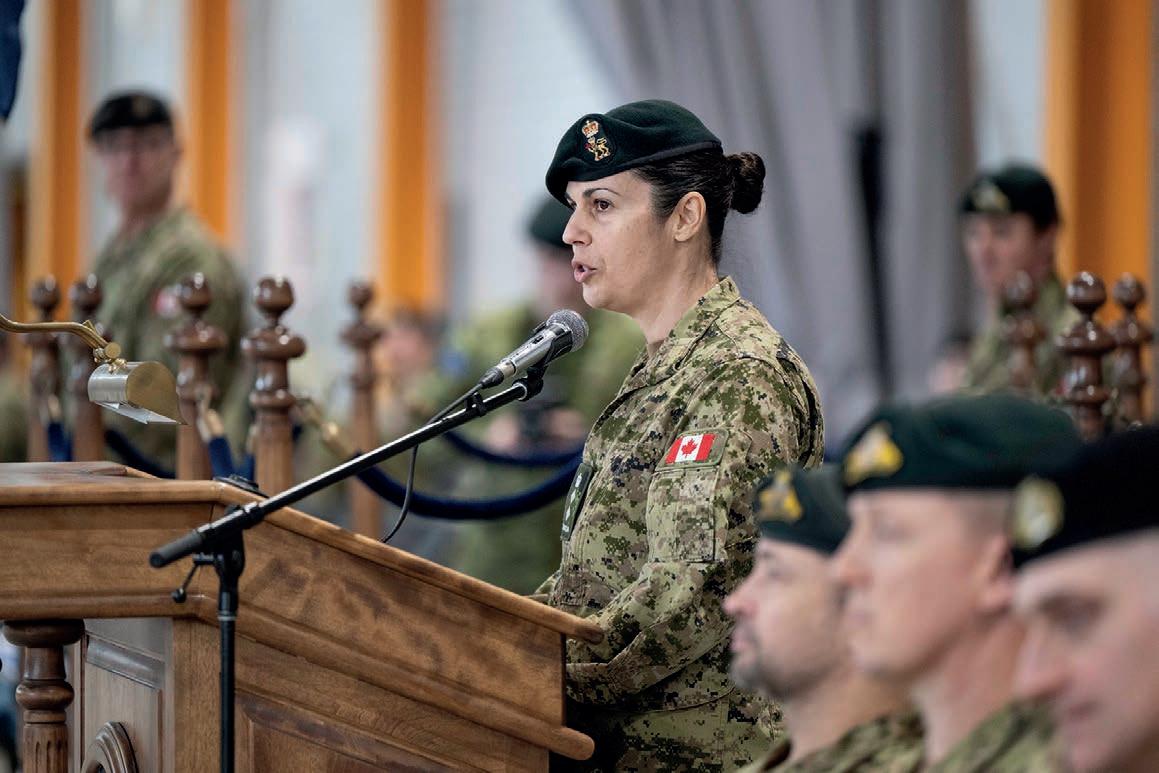 La colonnelle Véronique Gervais, chef d’état-major et représentante du CDIAC, pendant l’allocution qu’elle a prononcée lors de la cérémonie de transfert de l'autorité de commandement et d'appellation du CI 2 Div CA pour le CIA-Est, le 2 avril 2026. Colonel Véronique Gervais, Chief of Staff and representative of the CADTC, during her remarks at the ceremony marking the transfer of command and designation authority from 2 Cdn Div TC to ATC-East, on April 2, 2026.