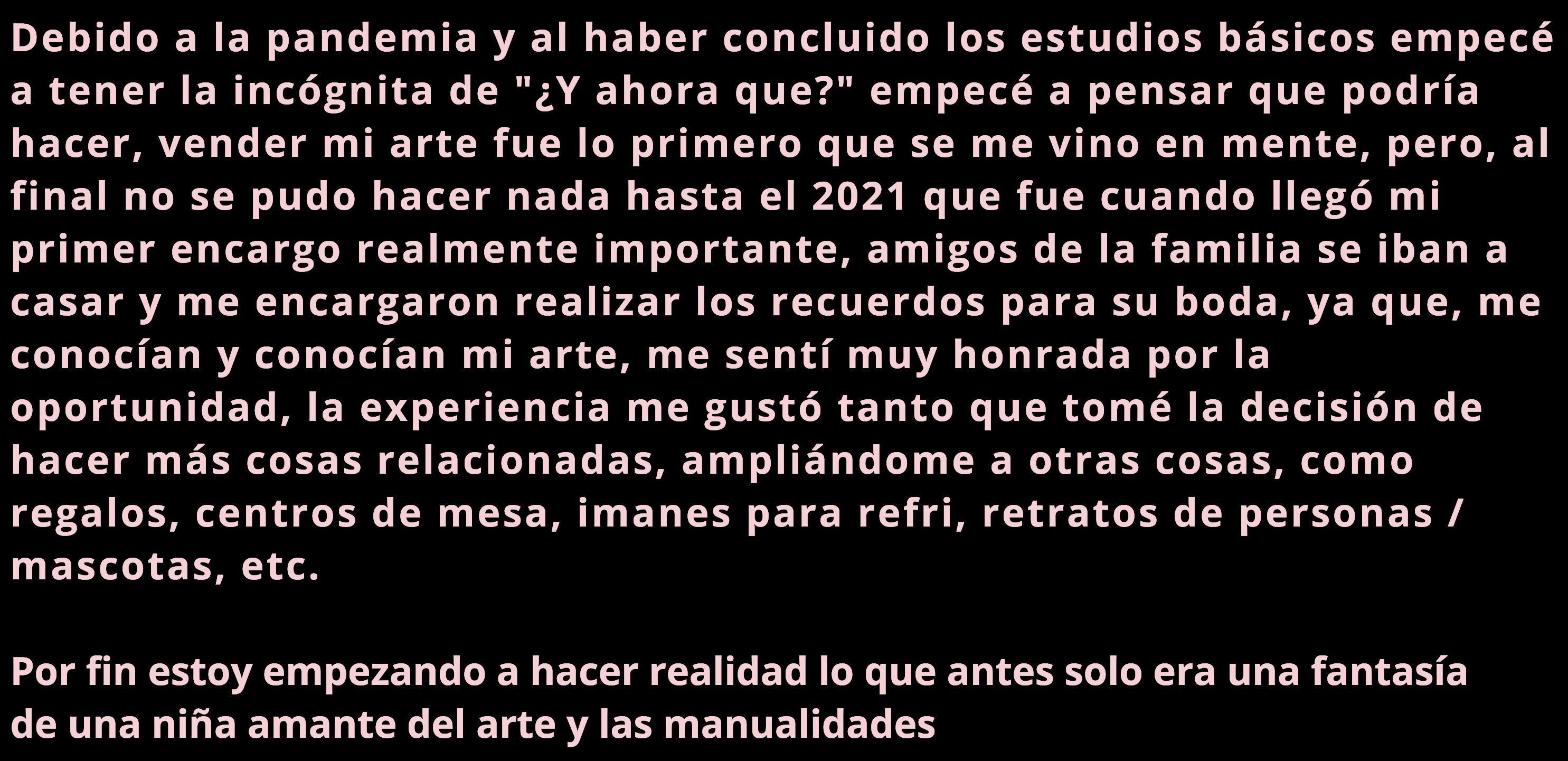 A mediano plazo me gustaría tener un buen número de clientes y ganancias, que me permita tener a futuro un espacio especializado para hacer los productos. A largo plazo, me gustaría tener un stand para exhibir productos en algún evento o programa. Quisiera ser percibida como una persona de confianza a la cual contactar cuando requieran algún recuerdo o regalo para su evento especial ya sea una boda, un baby shower, el día del(a) padre / m madre, un cumpleaños, etc.