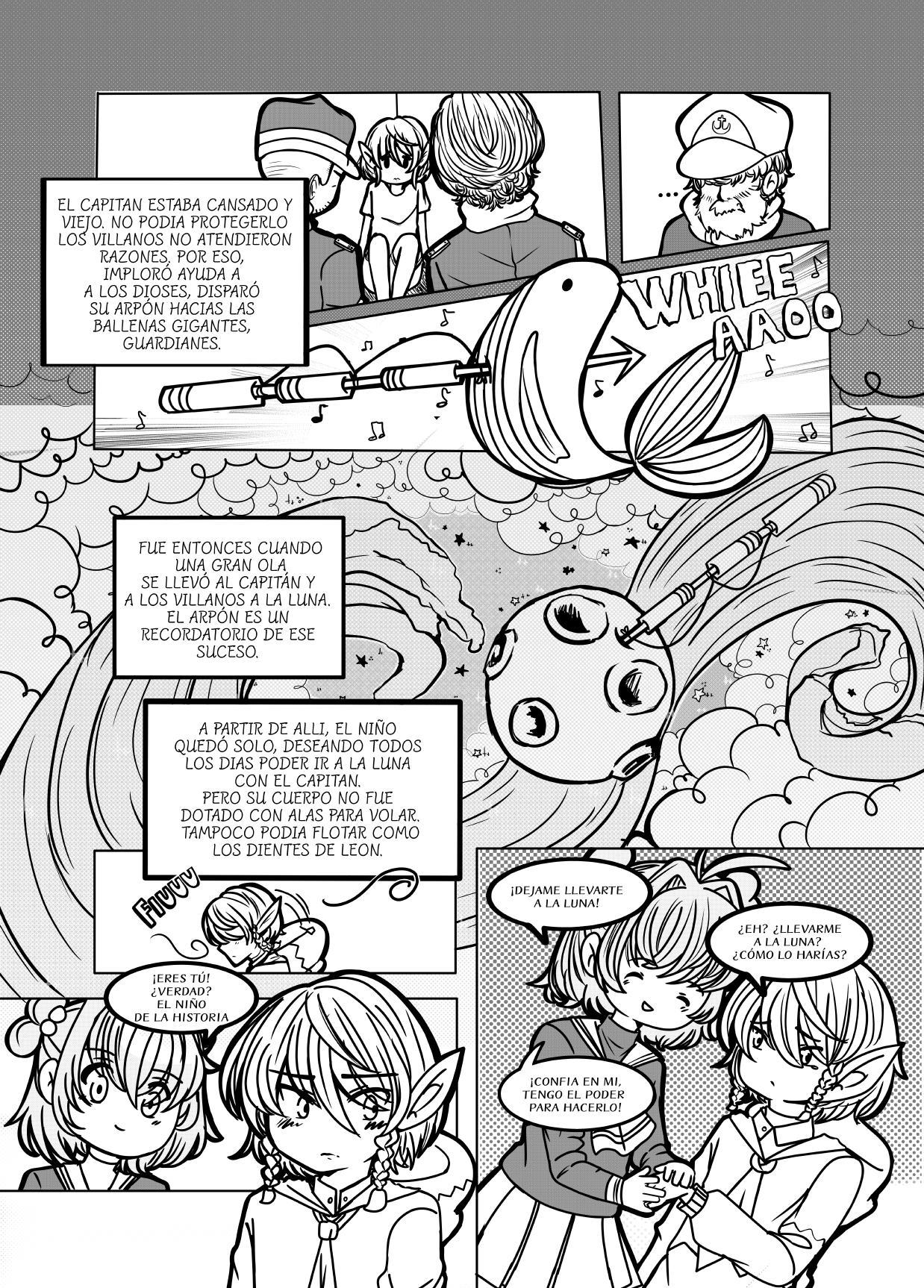 Entonces, una gran ola se llevó al Capitán… y a los villanos, directo a la luna. La lluvia cubrió al niño con un manto que lo hizo invisible al mundo. El arpón que está en la luna… es el del Capitán.
