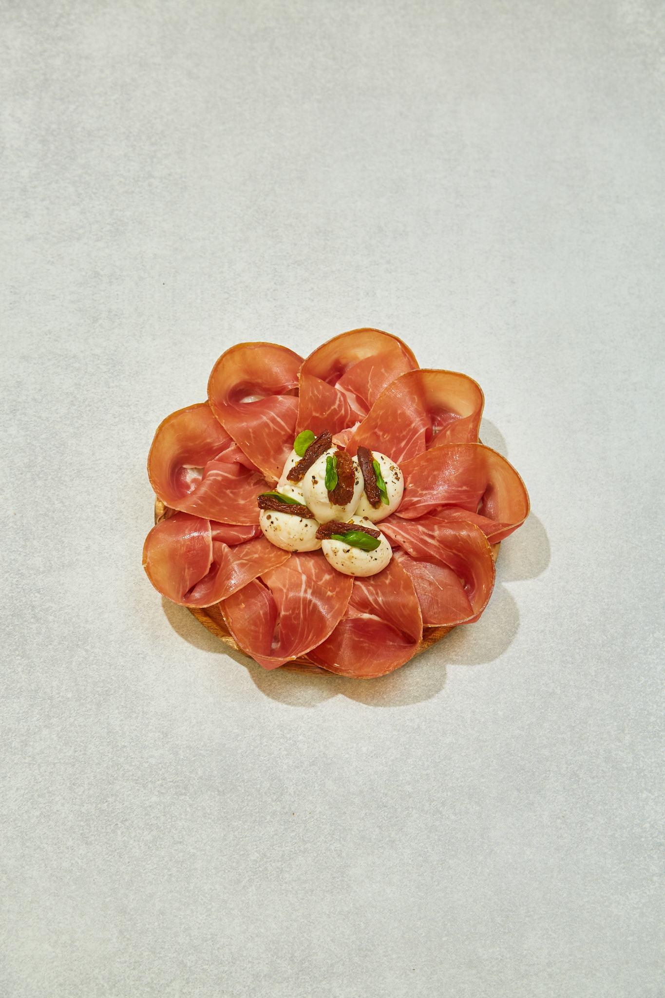Jamón crudo nacional 12 meses de maduración, Bocconcini, tomatitos secos, albahaca fresca.