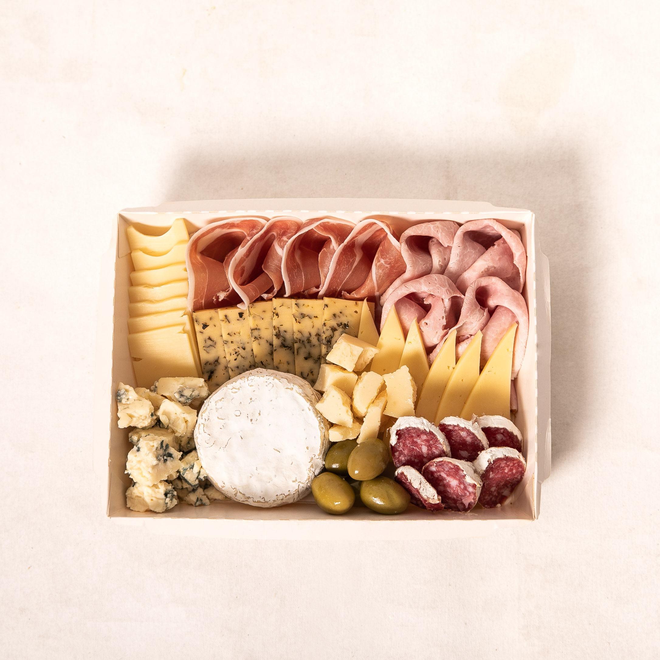 Jamón Crudo Tipo Español 14 Meses de maduración, Jamón Cocido Braseado, Chorizo Pamplona, Salame Tipo Rosette de Lyon, Mortadela Nacional Con Pistachos, Queso Fontina Val D’Aosta, Camembert x 200gr, Queso Atuel, Blue Cheese, Trenza Ahumada, Parmesano Grana, Aceitunas Rellenas con Morrón.