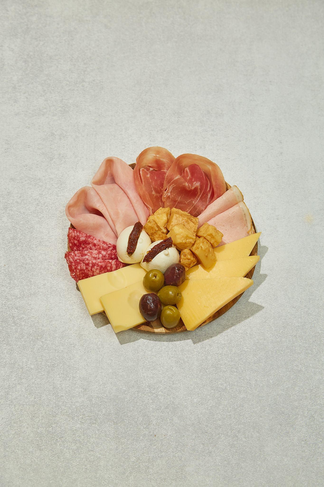 Dolce, Lomo Múnich, Bondiola casera, Mortadela con Pistachios, Salame tipo Piamontés picado fino, Tomates Cherry, Corazón de Alcaucil, Aceitunas verdes y negras descarozadas.