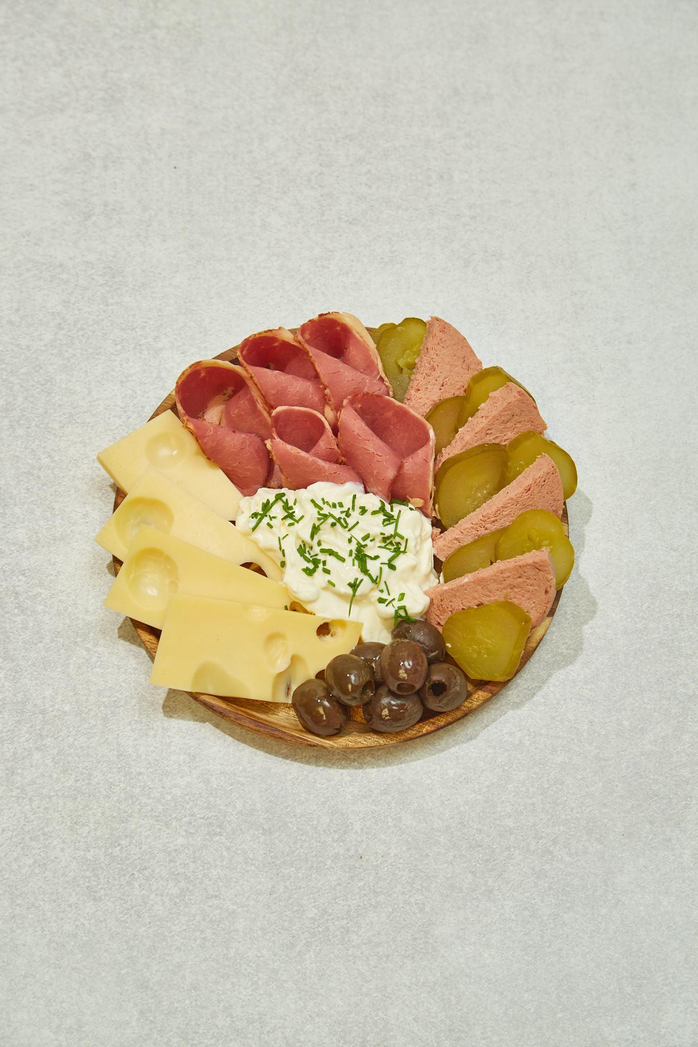 Pastrón casero, Leber natural, Pepinos agridulces, Gruyere Bola de nieve, Petit suisse alemán, Aceitunas negras descarozadas.
