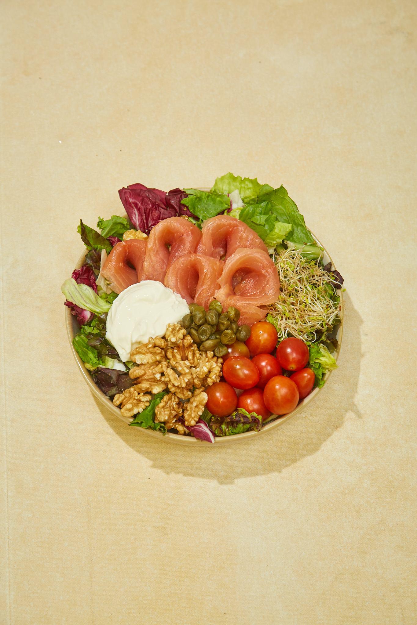 Salmón ahumado del Pacífico, queso blanco, alcaparras, nueces, selección de hojas verdes, brotes y tomates cherry.