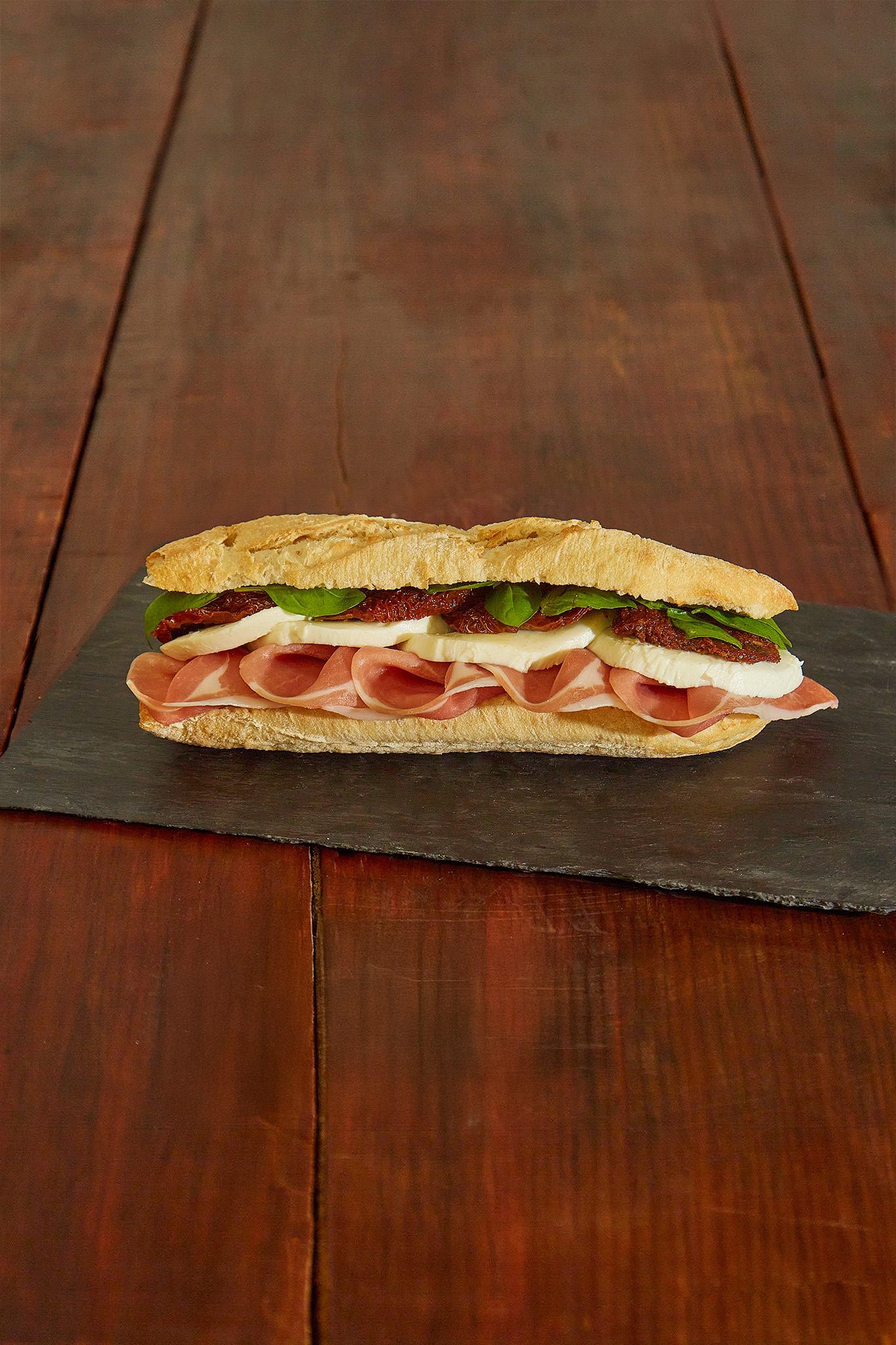 Jamón Crudo Nacional 12 meses de maduración, Brie Artesanal, hojas de rúcula y tomates secos.