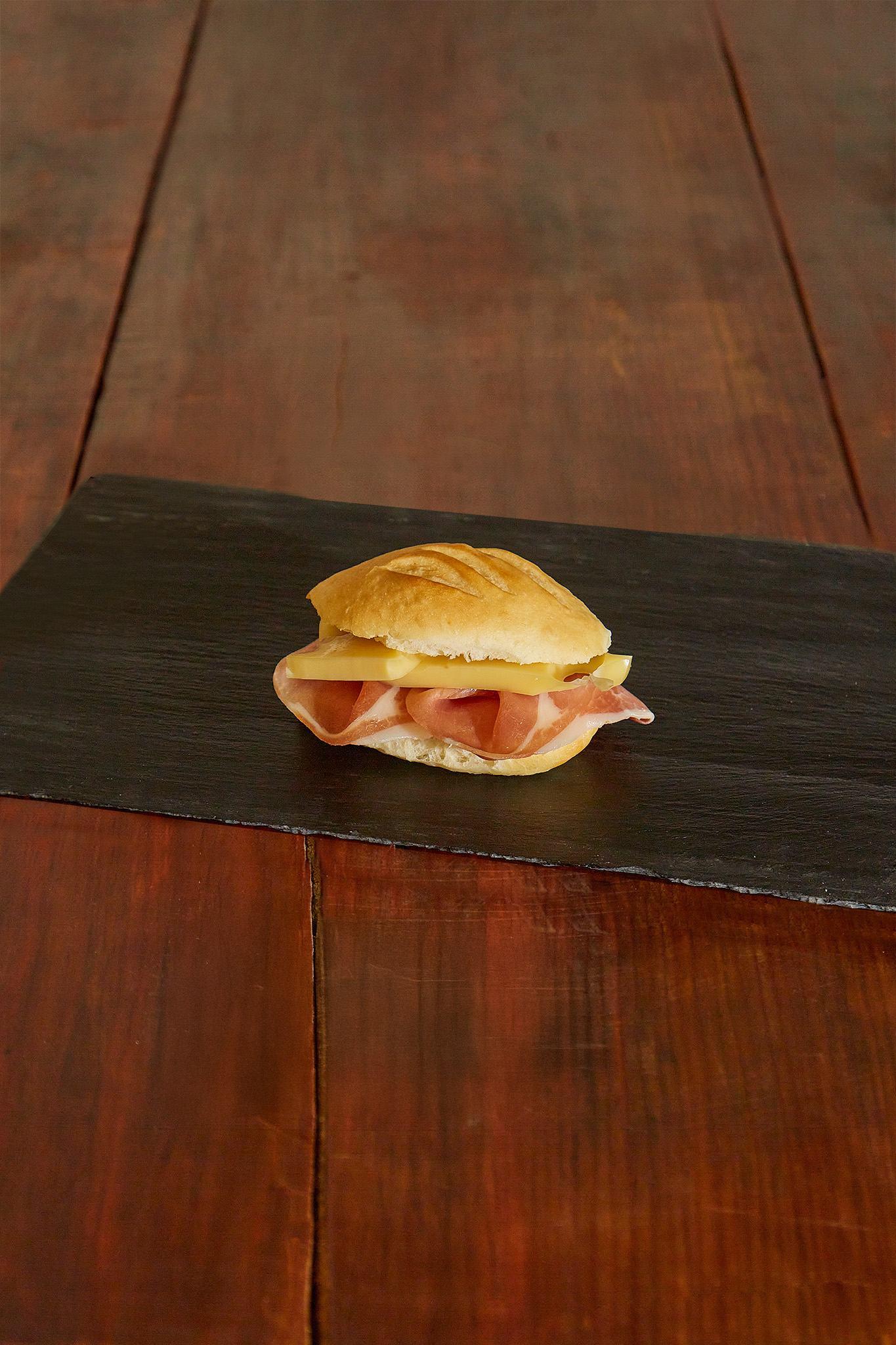 Jamón Crudo Nacional 12 meses de maduración, Gruyere Bola de Nieve con rúcula y mostaza en granos.