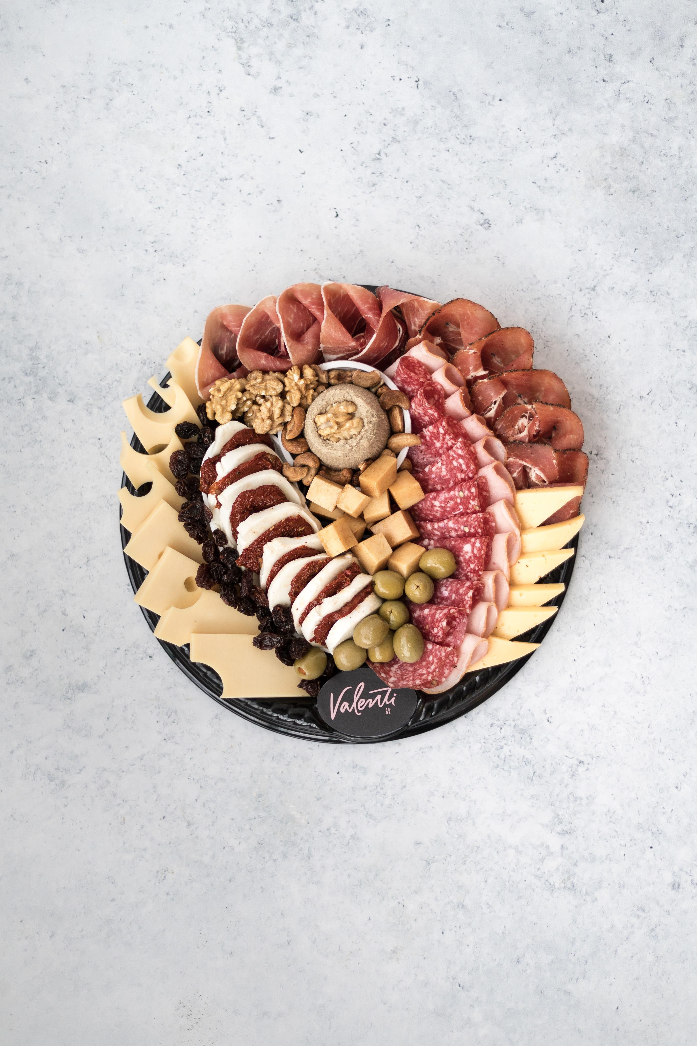 Gruyere Bola De Nieve, Fior Di Latte, Queso Gouda, Parmesano al Aceto, Jamón Crudo tipo Parma 12 meses de Maduración, Jamón Natural Valenti, Lomo Munich Ahumado, Salame tipo Italiano, Aceitunas Negras Descarozadas, Corazones de Alcauciles, Aceitunas Verdes rellenas con Morrón, Damascos,