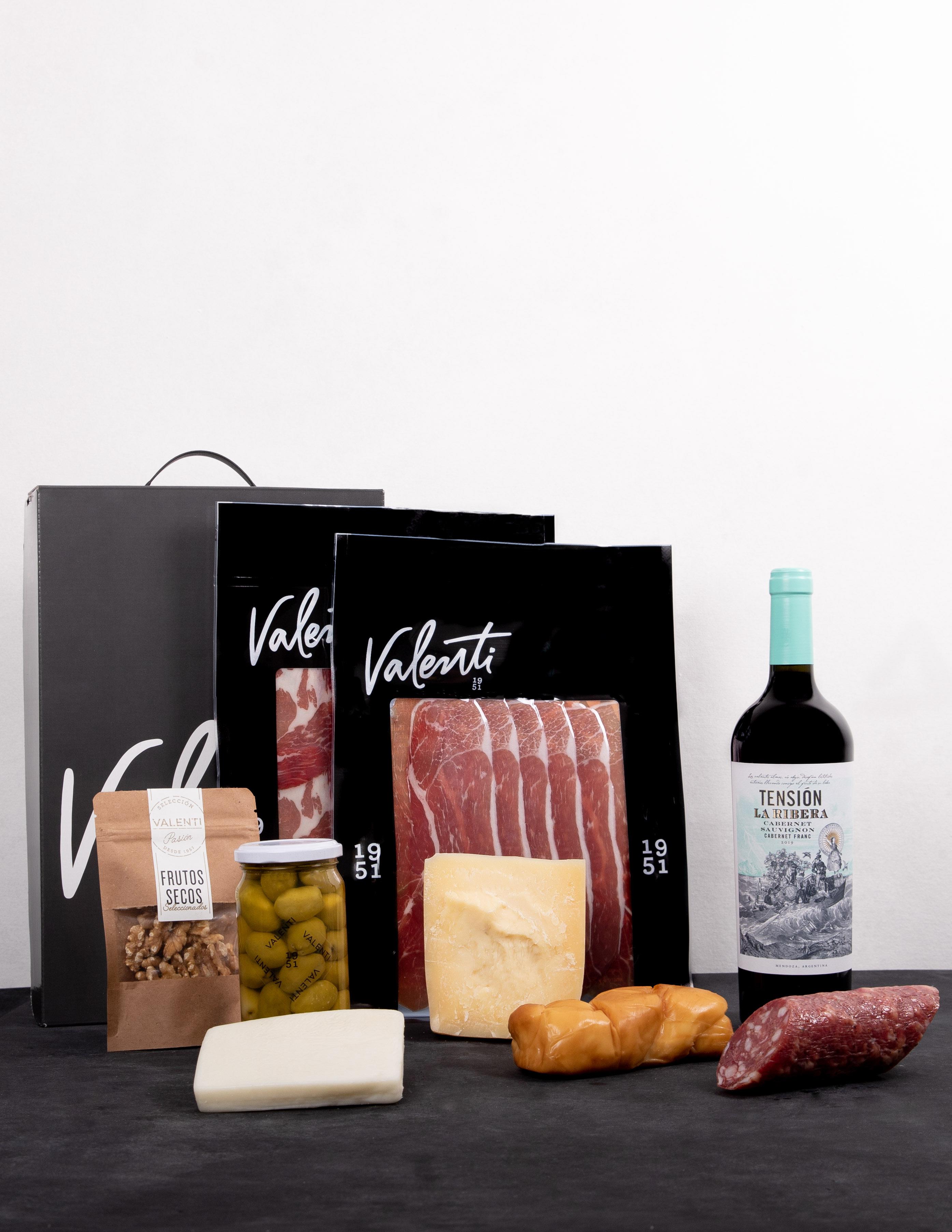 Tensión La Ribera Cab. Sauvignon - Cab. Franc Jamón Crudo Tipo Parma 12 Meses Bondiola Casera Salame Tipo Piamontés Picado Grueso Parmesano Grana Trenza Ahumada Feta Puro De Cabra Aceitunas Verdes Valenti 250 cc Snack de Frutos Secos Zuccardi Q Malbec