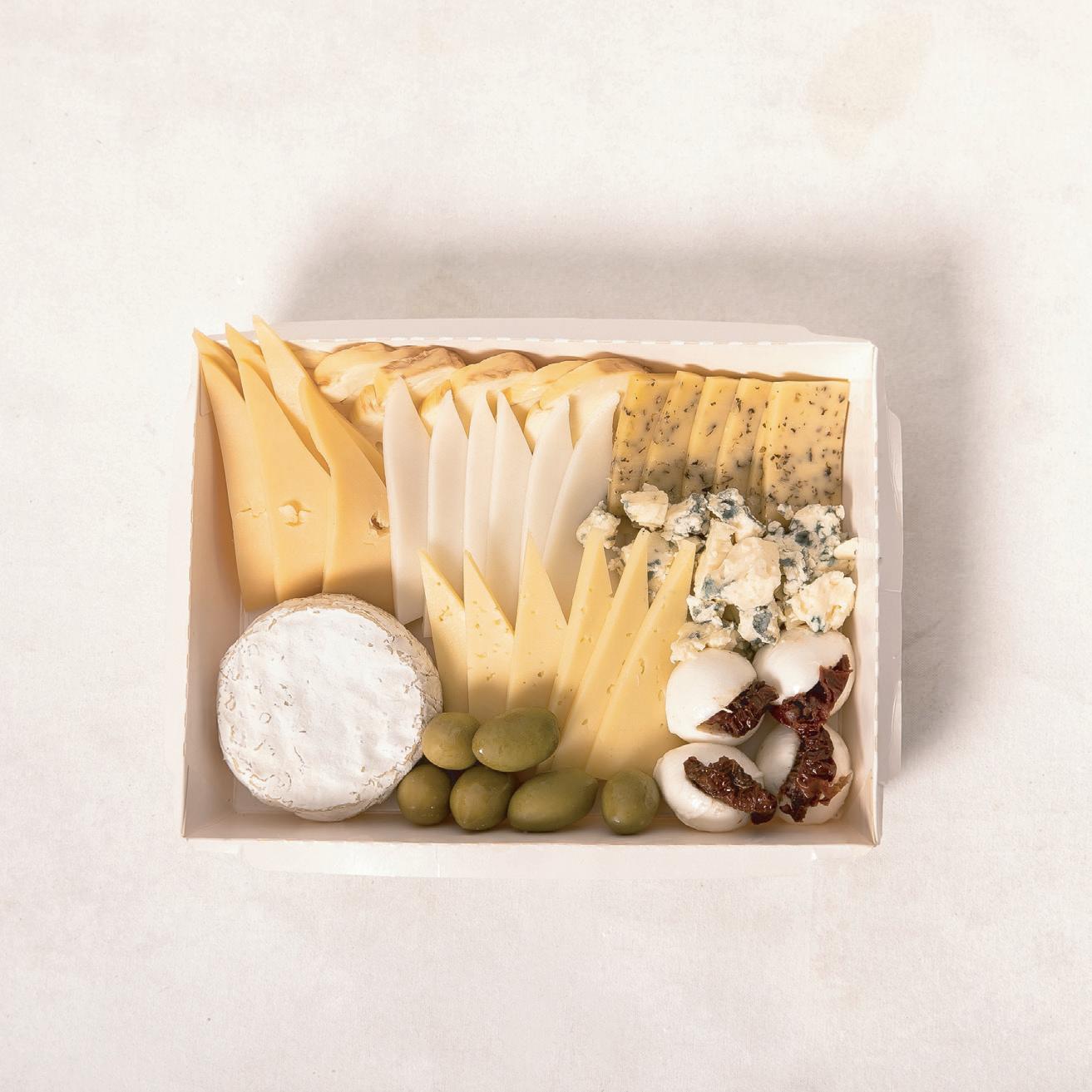 Emmental, Fior Di Latte con Tomates Secos, Grana Padano, Mini Camembert, Semi Duro de Cabra, Canestrato con Pimienta, Far cell, Cheddar, Morbier, Azul Valenti, Feta Preparado, Pat茅 de Ave al Champagne, Petite Suisse Alem谩n, Aceitunas verdes rellenas con morr贸n, Nueces Peladas, Damascos Turcos.