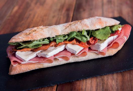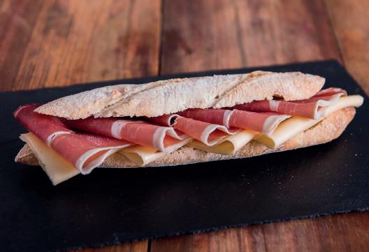 Jam贸n Crudo Nacional 12 meses de maduraci贸n, Brie artesanal, Hojas de r煤cula y Tomates secos.