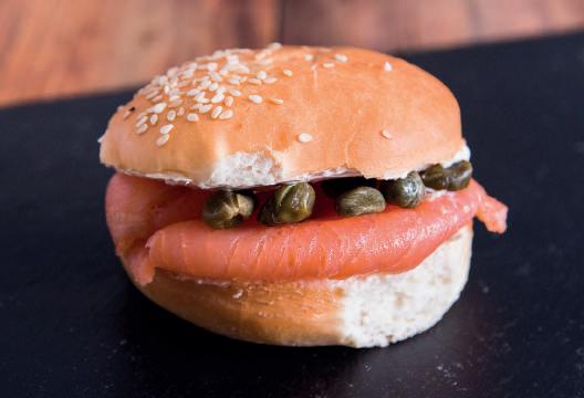 Salm贸n importado ahumado con le帽os del bosque, pasta petit suisse Valenti con Alcaparras y rodajas de lim贸n.