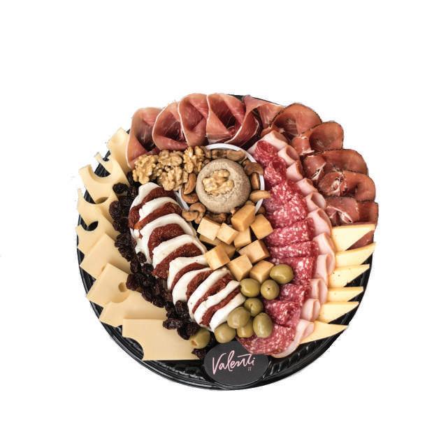 Gruyere Bola De Nieve, Fior Di Latte, Queso Gouda, Parmesano al Aceto, Petit Suite, Jamón Crudo Tipo Parma 12 meses de Maduración, Jamón Natural Valenti, Lomo Munich Ahumado, Salame tipo Italiano, Mortadela con Pistachio, Paté al Champagne, Aceitunas Negras Descarozadas, Corazones de Alcauciles, Aceitunas Verdes rellenas con Morrón, Pasas Sultaninas Rubias, Nueces Peladas, Tomates Secos.
