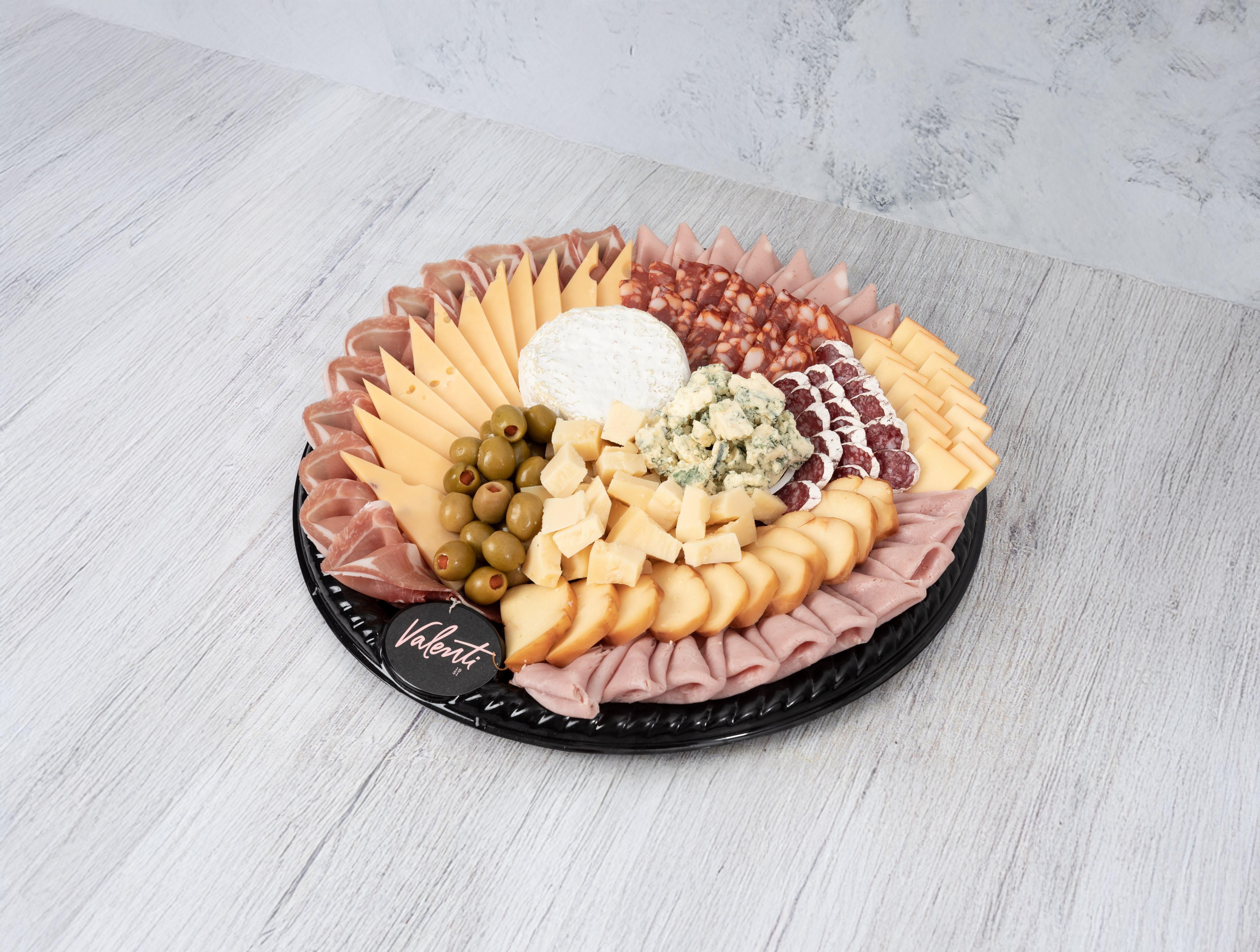 Gruyere Bola De Nieve, Gouda Artesanal, Parmesano Estacionado, Azul Valenti, Banquete de Tandil condimentado, Jamón Crudo tipo Parma 12 meses, Jamón Cocido Braseado, Salame tipo Rosette de Lyon, Aceitunas Verdes rellenas con Morrón, Mini Camembert, Marineras