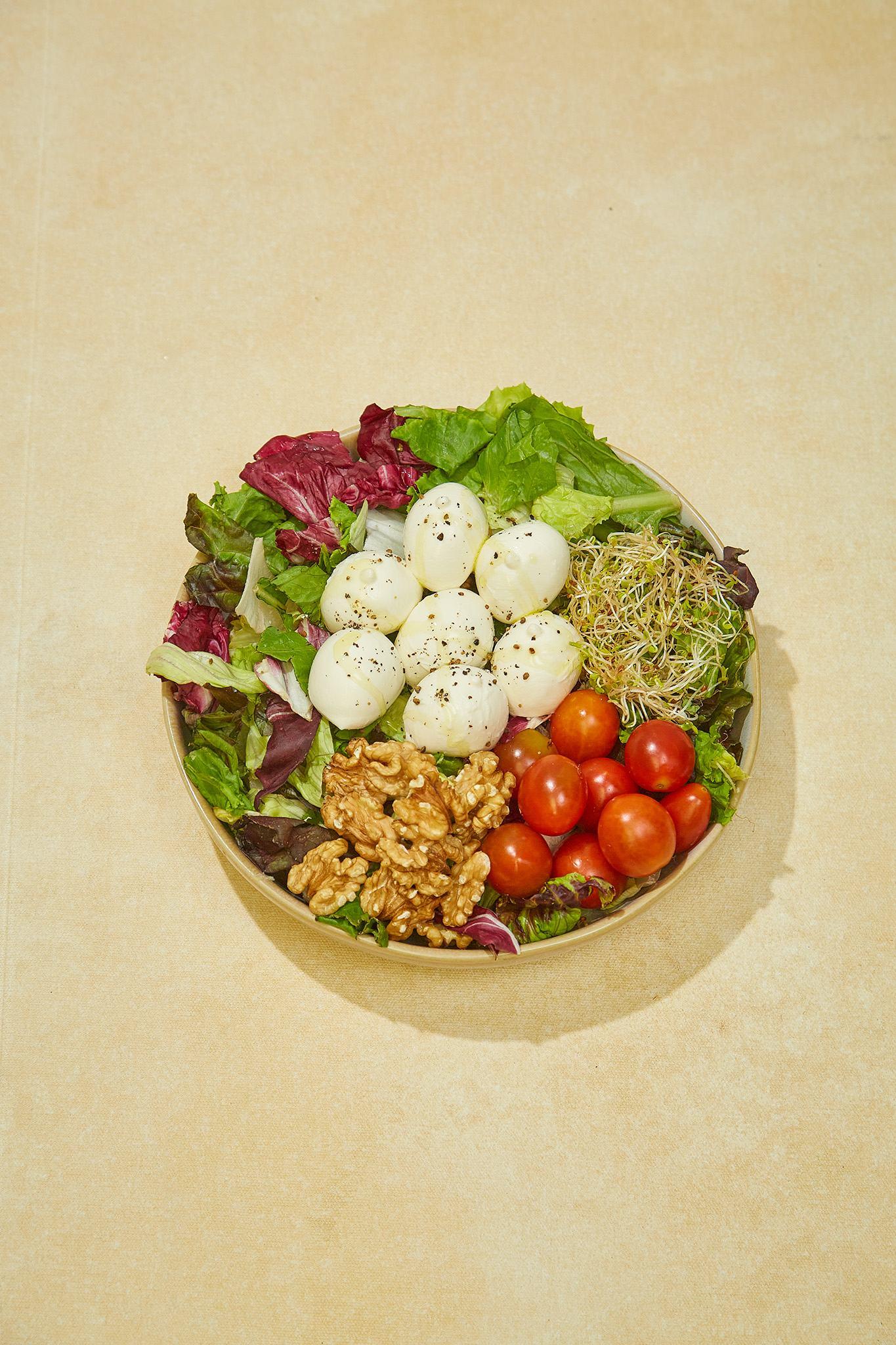 Boconccinos, nueces, selección de hojas verdes, brotes y tomates cherry