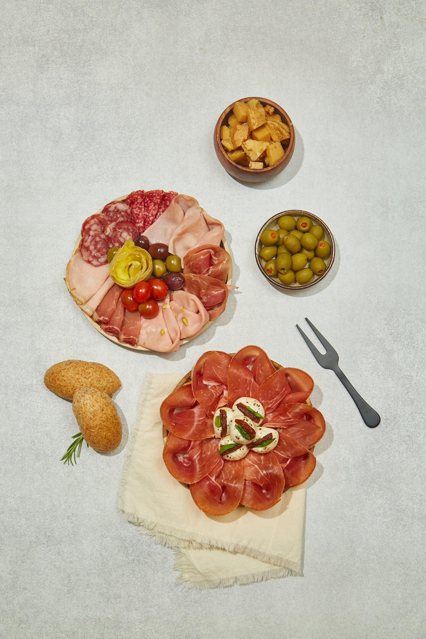 Jamón crudo, Jamón Cocido, Salame Dolce, Lomo Múnich, Gouda, Gruyere Bola de nieve, Parmesano al aceto, Boconccini, Aceitunas negras descarozadas, Aceitunas verdes y Tomates secos.