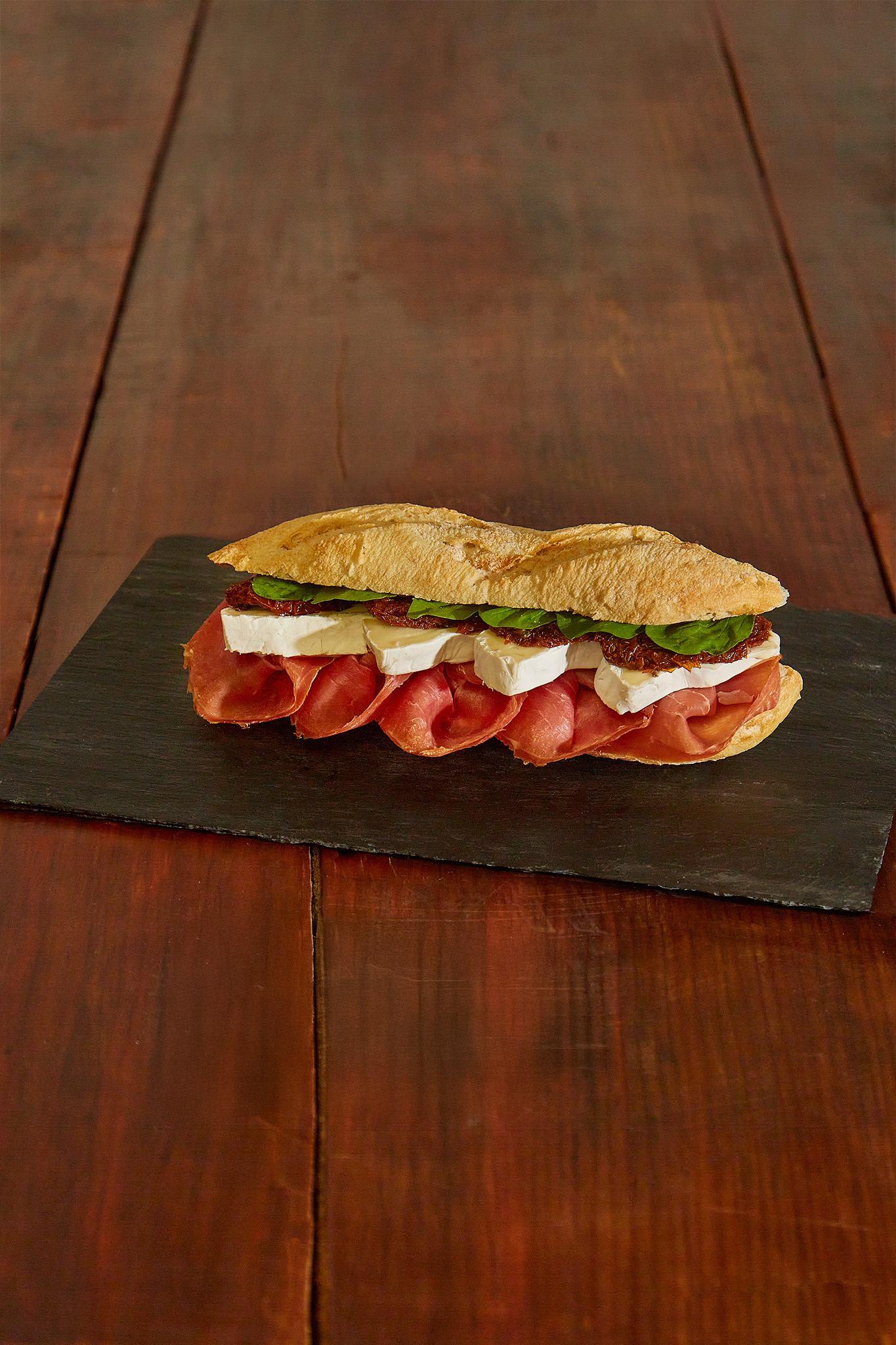 Jamón Crudo Nacional 12 meses de maduración, Brie Artesanal, hojas de rúcula y tomates secos. $ 15.500