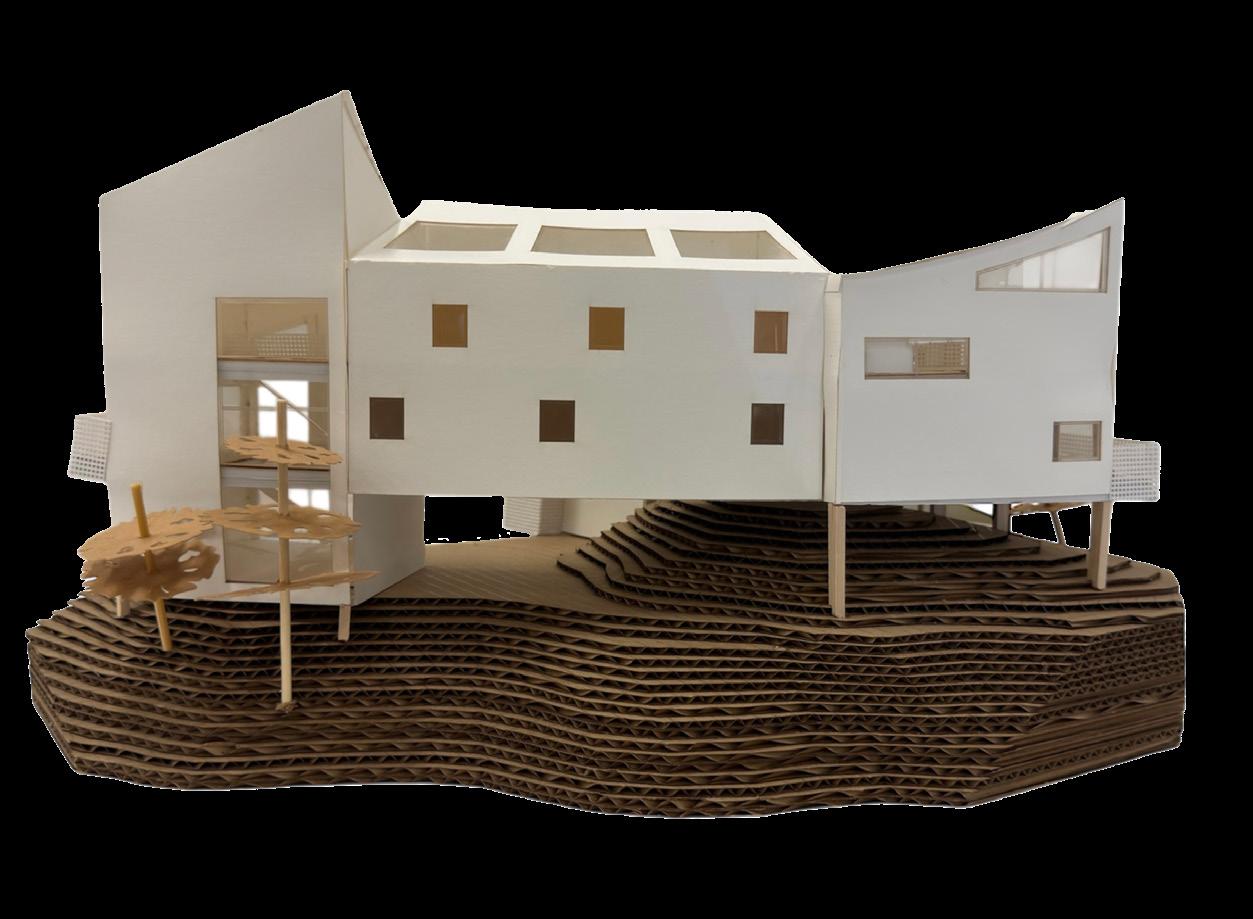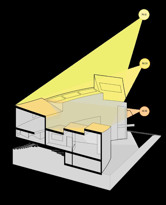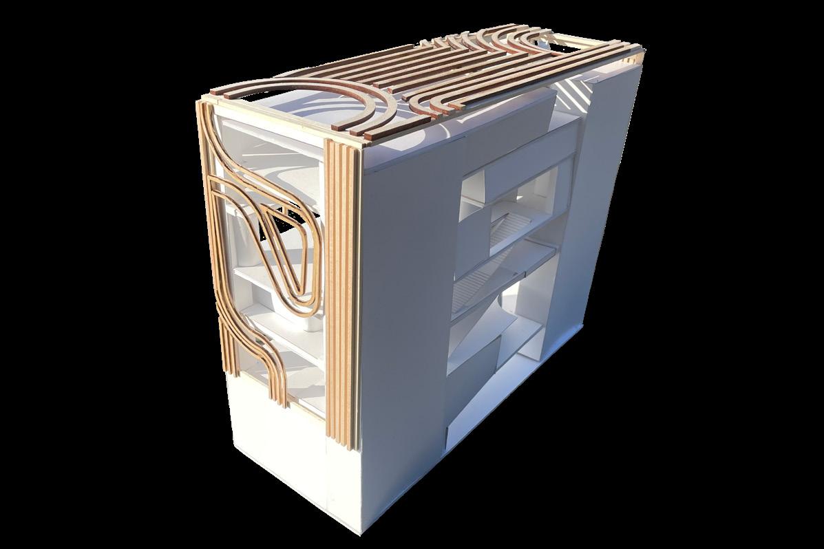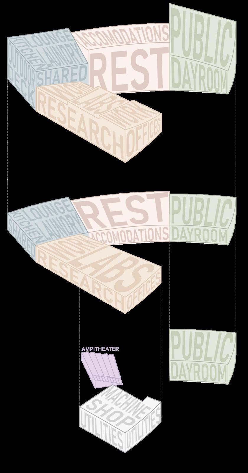 The program is organized using solar position, and how it relates to the activity happening in certain spaces. For example, the office and labs are north facing, using indirect sunlight and large curtain walls to create a more enjoyable workspace. The scupltural roof shapes are informed by solar angles, with skylights that “scoop” and diffuse light into the building.