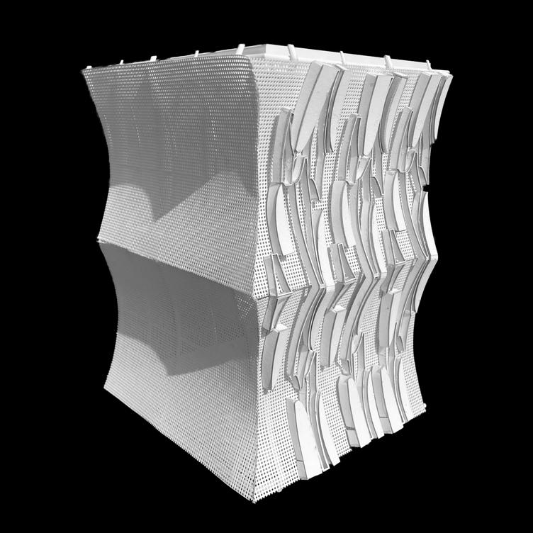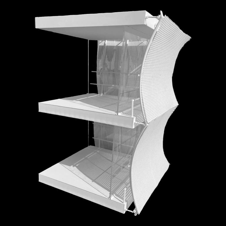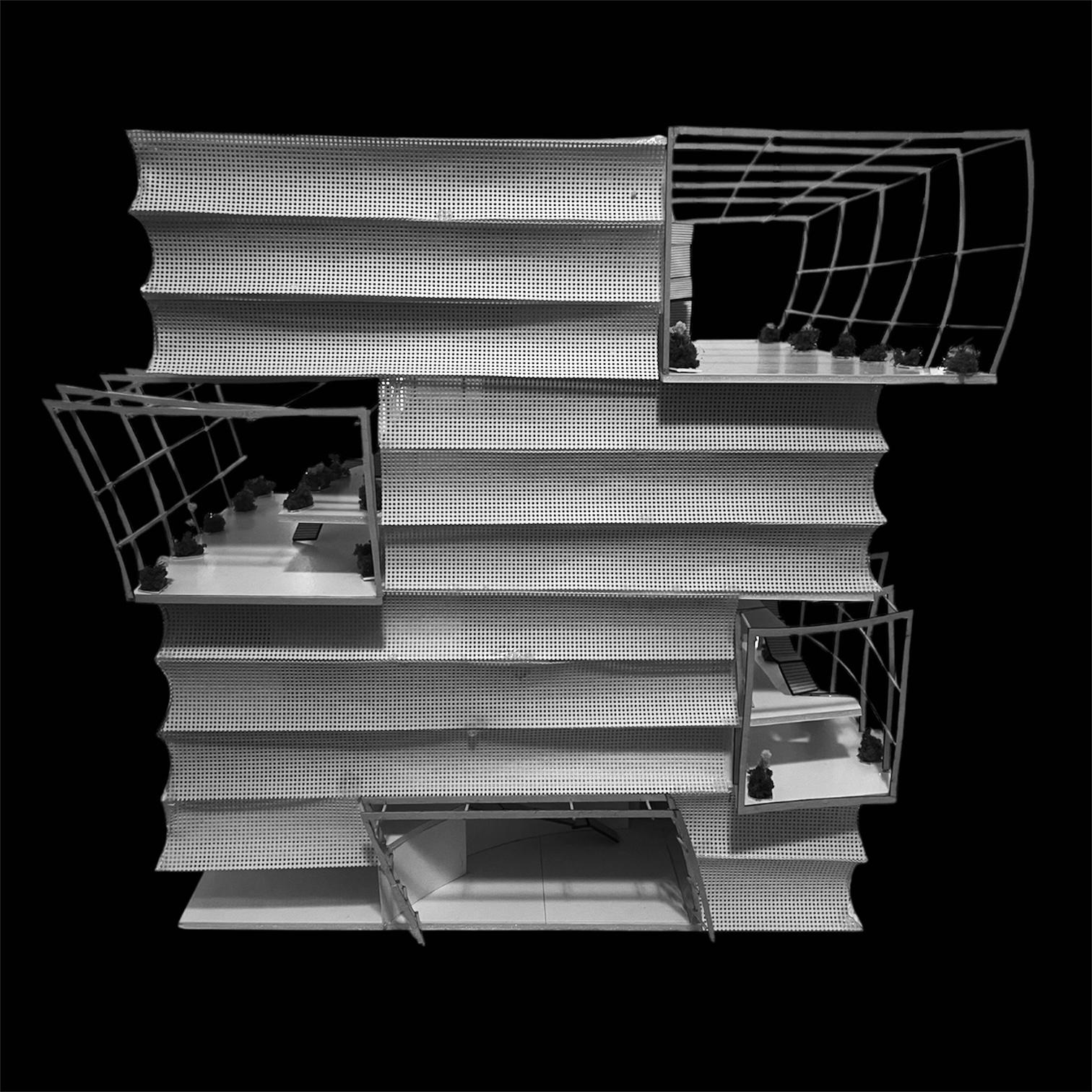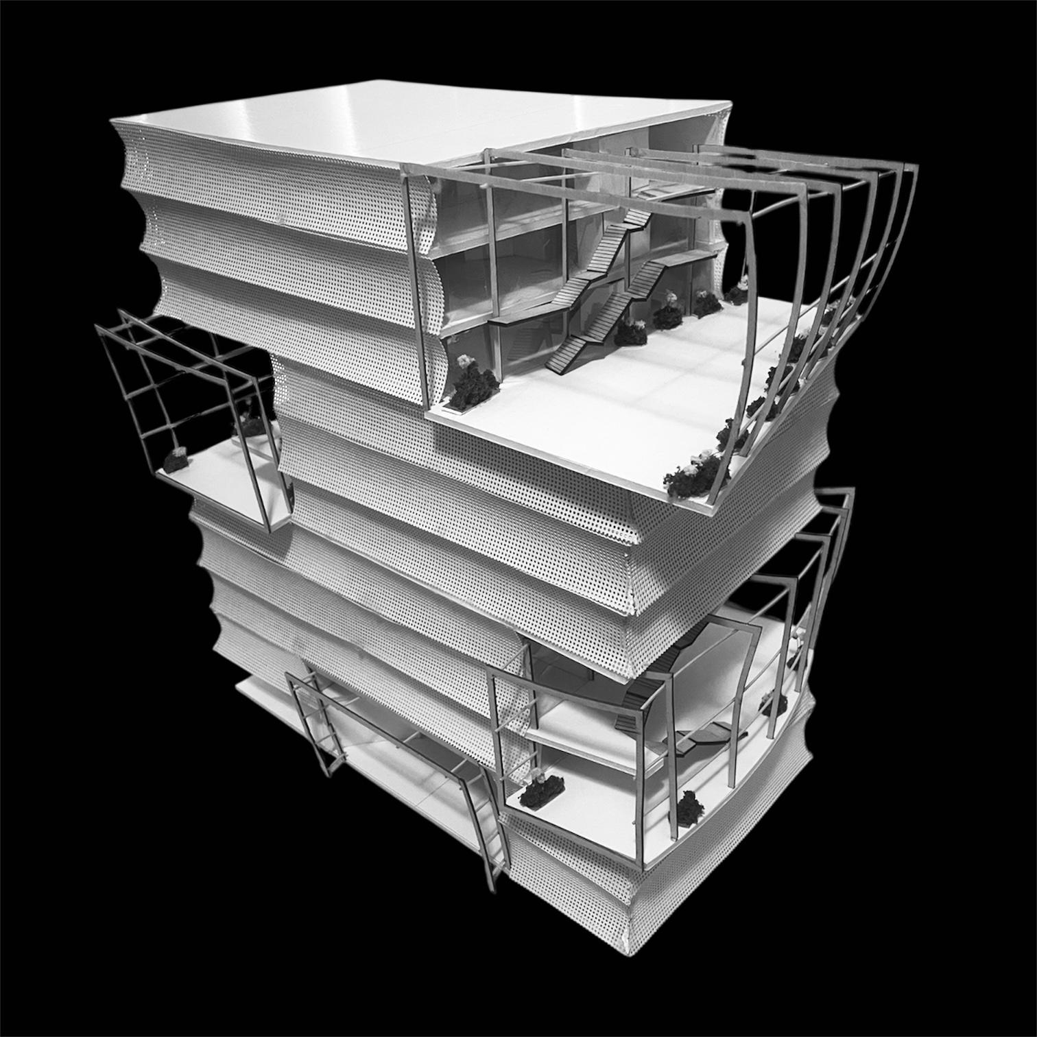 The facade of this project took the geometries from the kitbash exercise, where each geometry was made either solid, frame, or void to provide solar shading. The atriums were covered in a wire mesh, with visible steel frames to further emphasize the contrast between the building and voids.