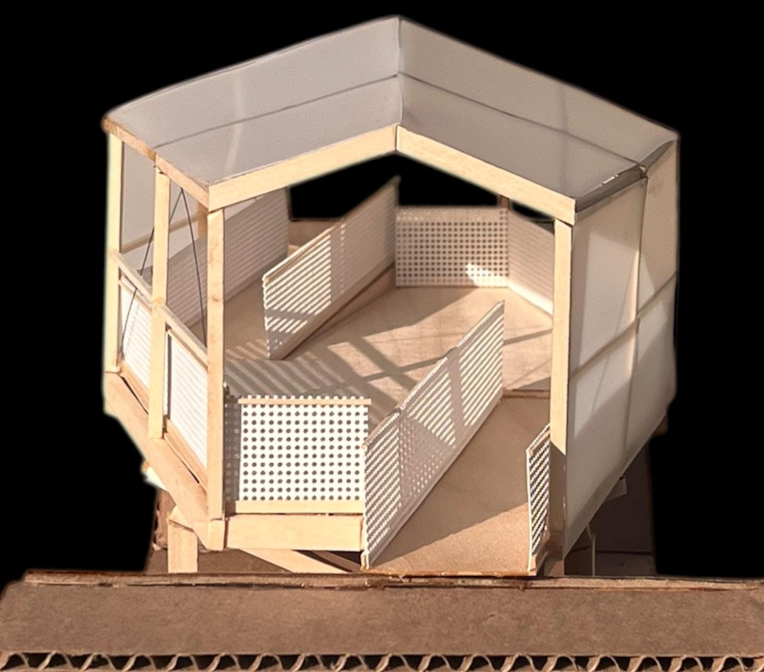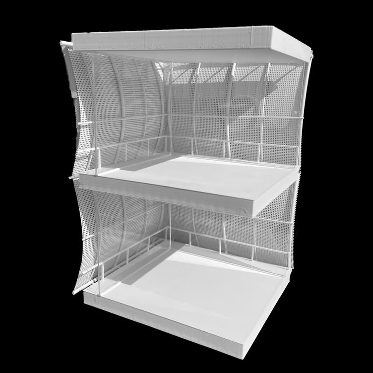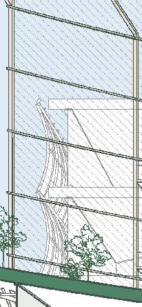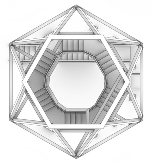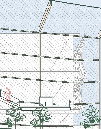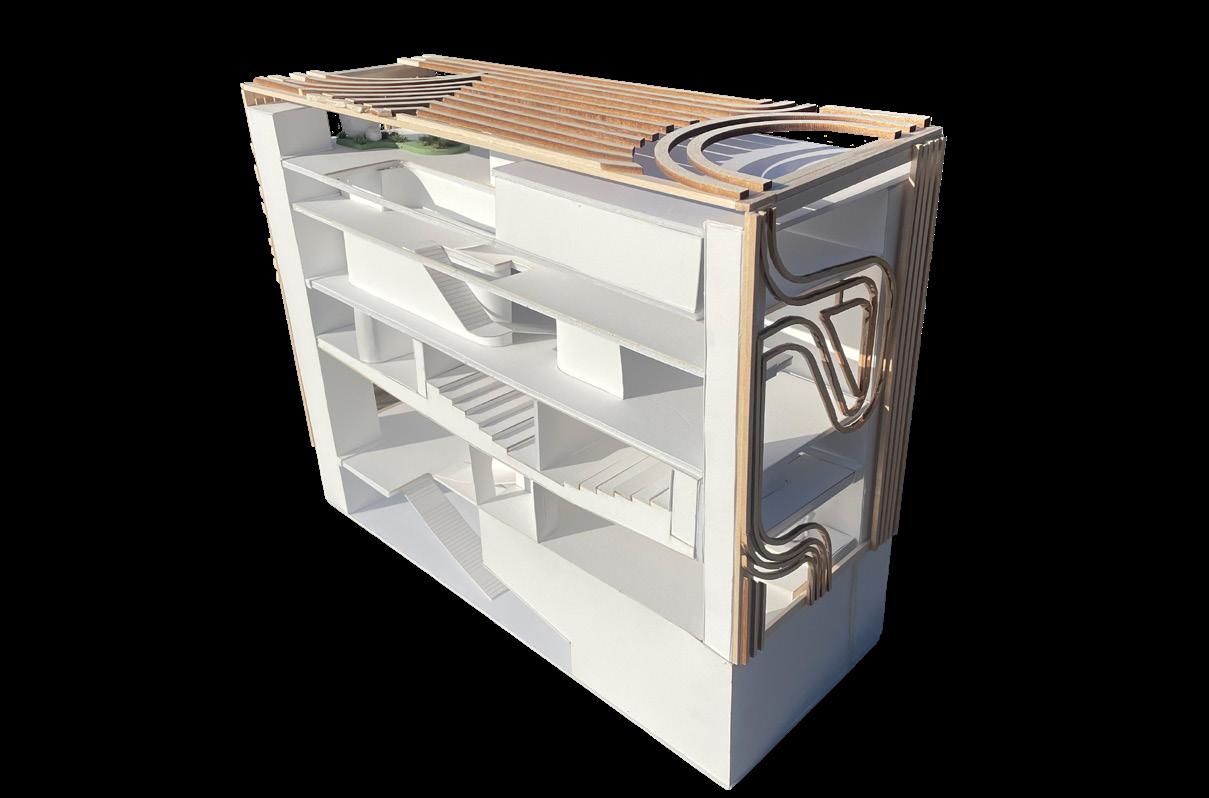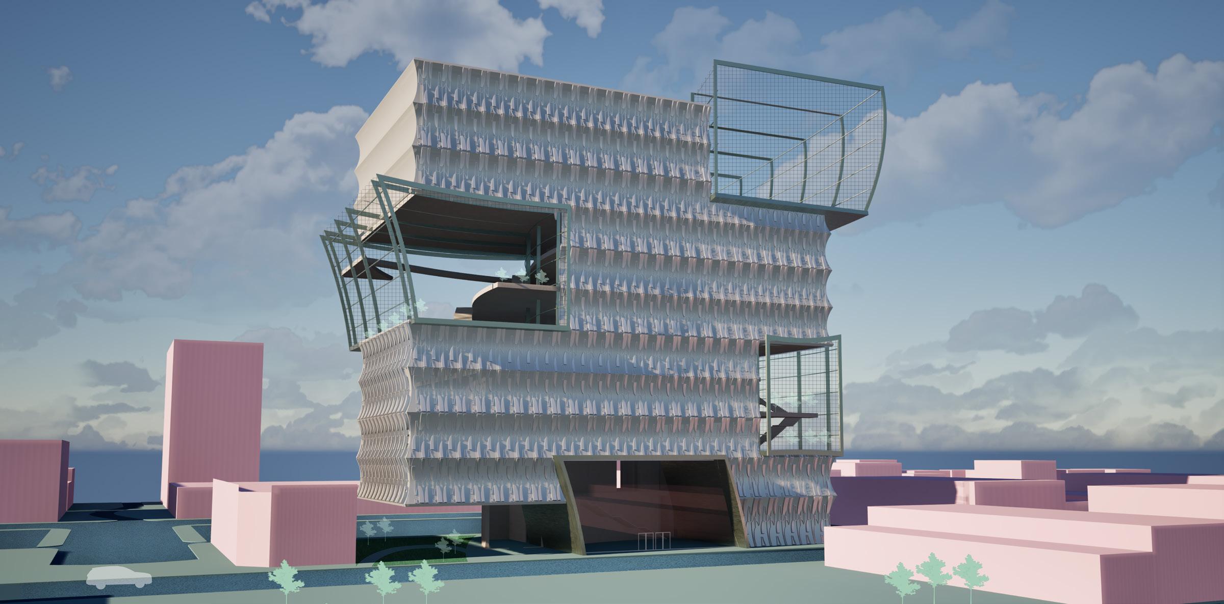 The facade of this project took the geometries from the kitbash exercise, where each geometry was made either solid, frame, or void to provide solar shading. The atriums were covered in a wire mesh, with visible steel frames to further emphasize the contrast between the building and voids.