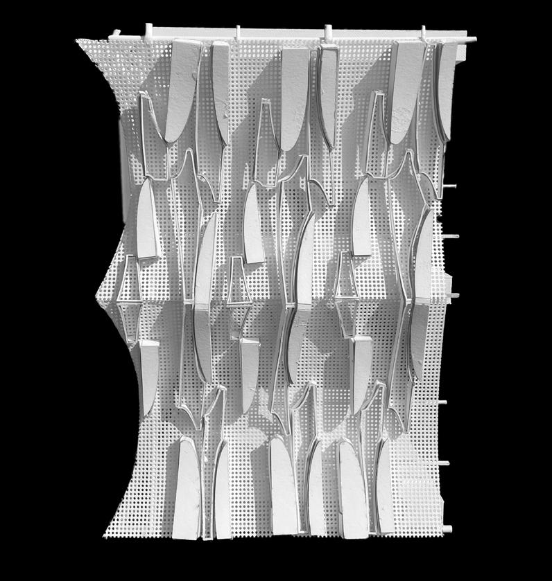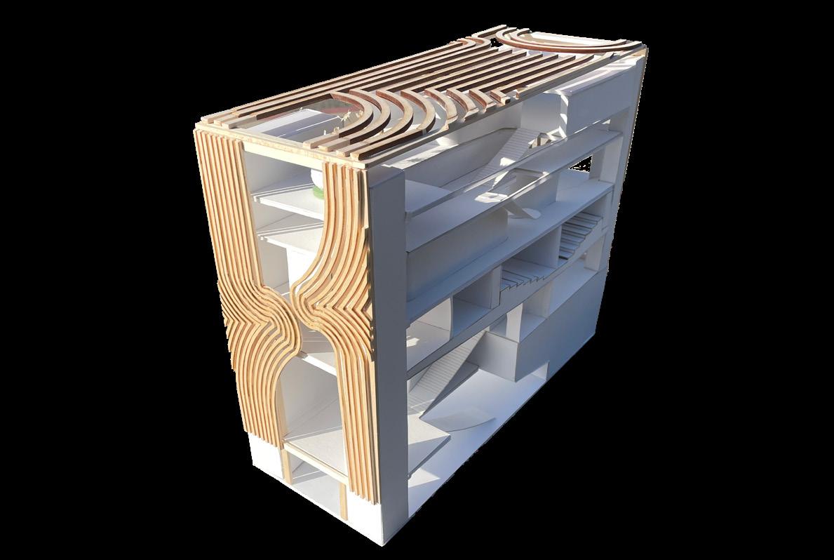 Inspired by movie scores, the plan mimics soundwaves, with undulating walls, allowing for a unique experience, giving the user a sense of discovery as they round each corner. The facade continues this, and through its fins, diffuses sunlight into spaces.