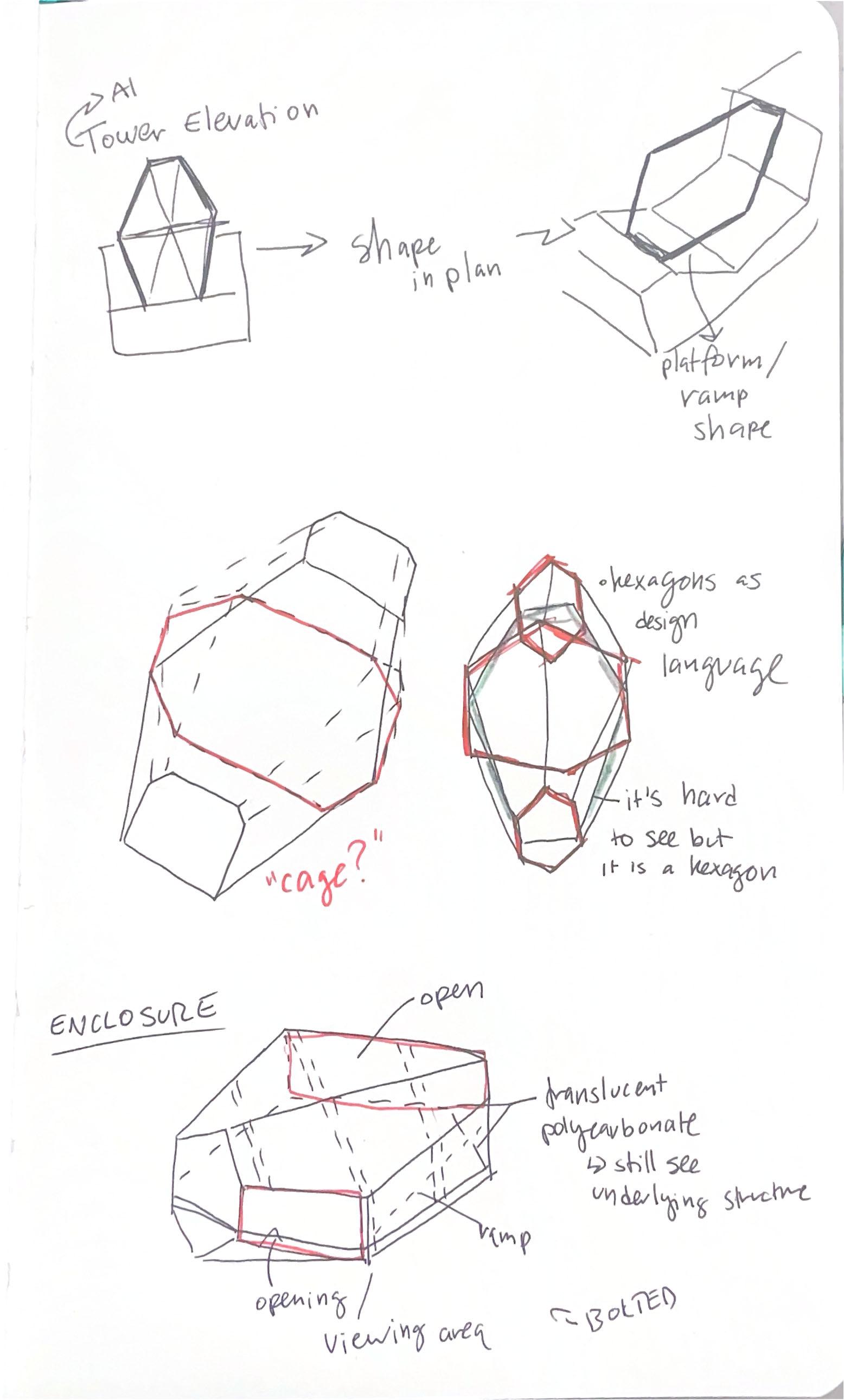 Facade exploration began through precedent studies, where each “layer” was analyzed to reveal its underlying geometries, alignments, and systems. From there, these geometries were kitbashed to create a geometric expression for my facade. Elevation studies were done in tandem to define the relationship between “building” and “atrium” as a contrast between a mesh facade and skeleton-like atriums.