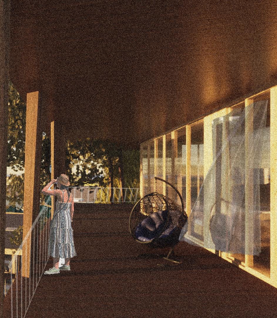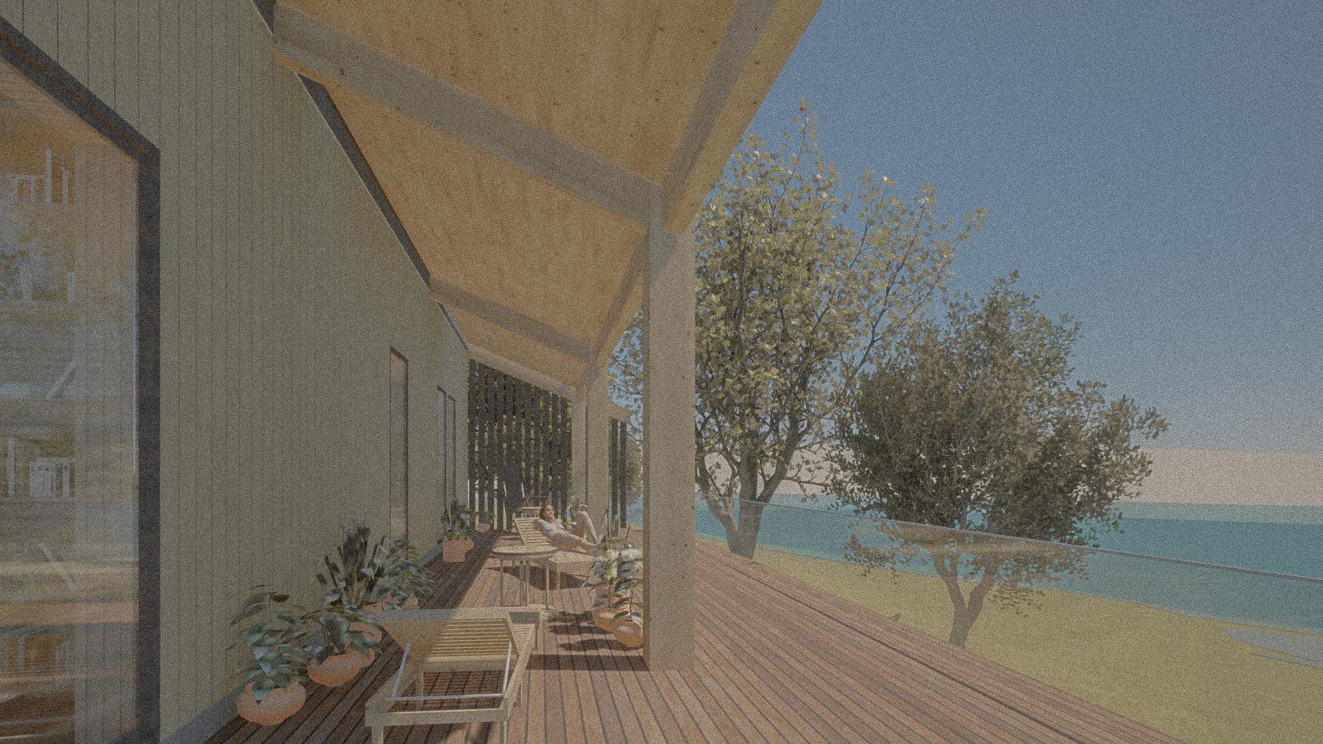 L’espace est encadré par des poteaux placés de manière irrégulière qui répondent aux tronc des arbres qui créent un sentiment d’intimité. De larges avant-toits protègent agréablement le bâtiment du soleil de l’après-midi.