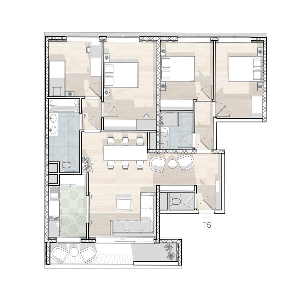 Pour ce qui des orientations spatiales, les séjours/pièces de vie de chaque logement s’ouvrent largement sur des espaces extérieurs, terrasse ou jardin, plus ou moins intimistes grâce à leurs baies vitrées généreuses. Chaque penthouse offre une juste composition entre pièces de vie et espaces de nuit, cultivant et développant l’espace des unes tout en préservant l’intimité des autres.