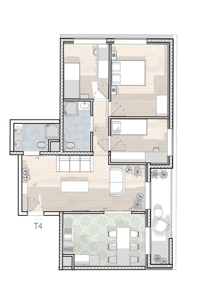Les appartements des immeubles nouvellement conçus sont compacts mais fonctionnels, avec des tailles différentes, du T2 au T4, et pourront accueillir le maximum de personnes. Tous les logements sont situés dans les orientations les plus favorables du soleil, et sur l’un des bâtiments, afin d’orienter tous les logements vers le sud-est, j’ai situé la coursive de l’étage entièrement vers le nord-ouest.