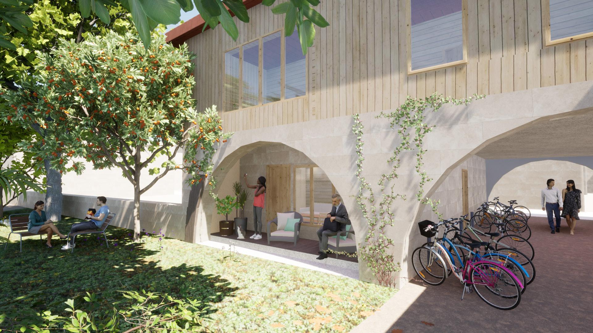 Au coin d’un des bâtiments, j’ai conçu un café qui aura des tables à l’extérieur, situé dans le tunnel à côté qui vient les ombrager. Et afin d’utiliser au maximum l’espace dans l’autre tunnel, j’ai prévu un parking à vélos et l’escalier du bâtiment.