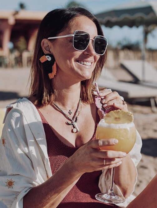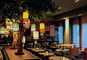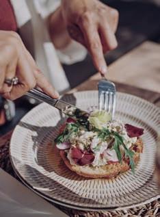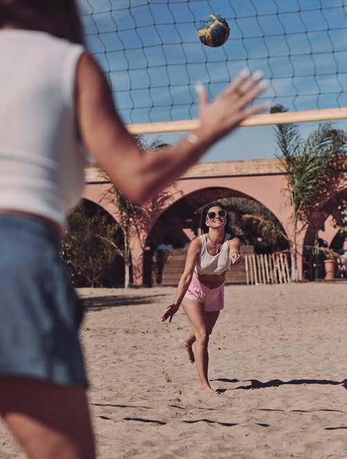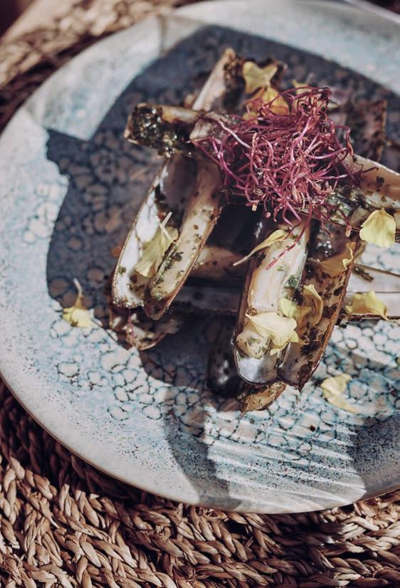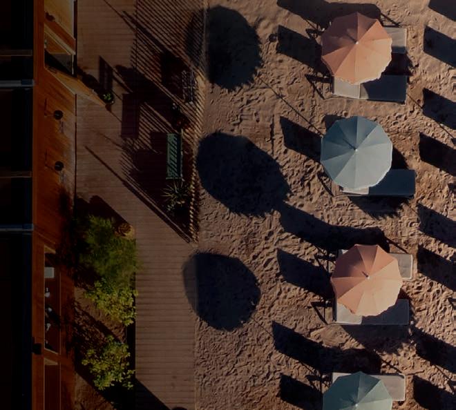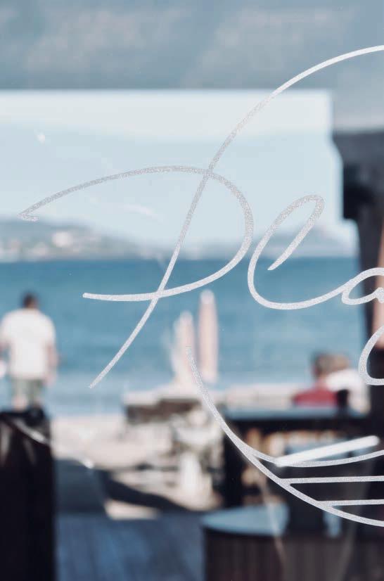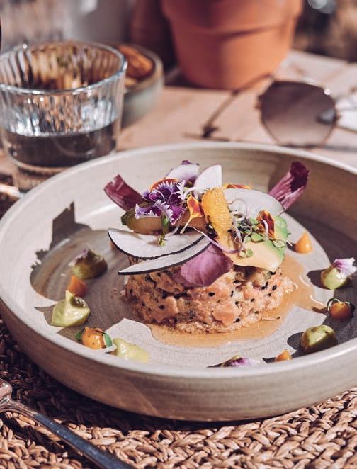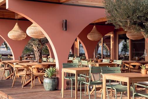 vieren. Van gezinnen met kinderen die uren in het zand spelen, stellen die tijd voor elkaar willen hebben tot vriendengroepen die samenkomen: voor iedereen is deze beachclub een heerlijke plek. Je ziet meteen dat er veel aandacht is besteed aan de inrichting. Valk Design zorgde ook hier voor de perfecte afstemming van materialen, kleuren en details. Met veel hout, planten en zachtroze en groene tinten is het een verrassend en sfeervol geheel. De twee grote olij omen zijn de eyecatchers op het terras. Zoek een tafeltje uit en bestel wat je wil van de menukaart. De beachclub heeft een eigen chef-kok die met zijn team de lekkerste gerechten bereidt voor lunch en diner. Ook zijn er allerlei snacks te bestellen. Kleurrijk en smaakvol: dat is waar het in dit restaurant om draait. Denk aan zomerse salades, clubsandwiches, verse vis, hamburgers en plankjes met kaas en charcuterie om te delen.