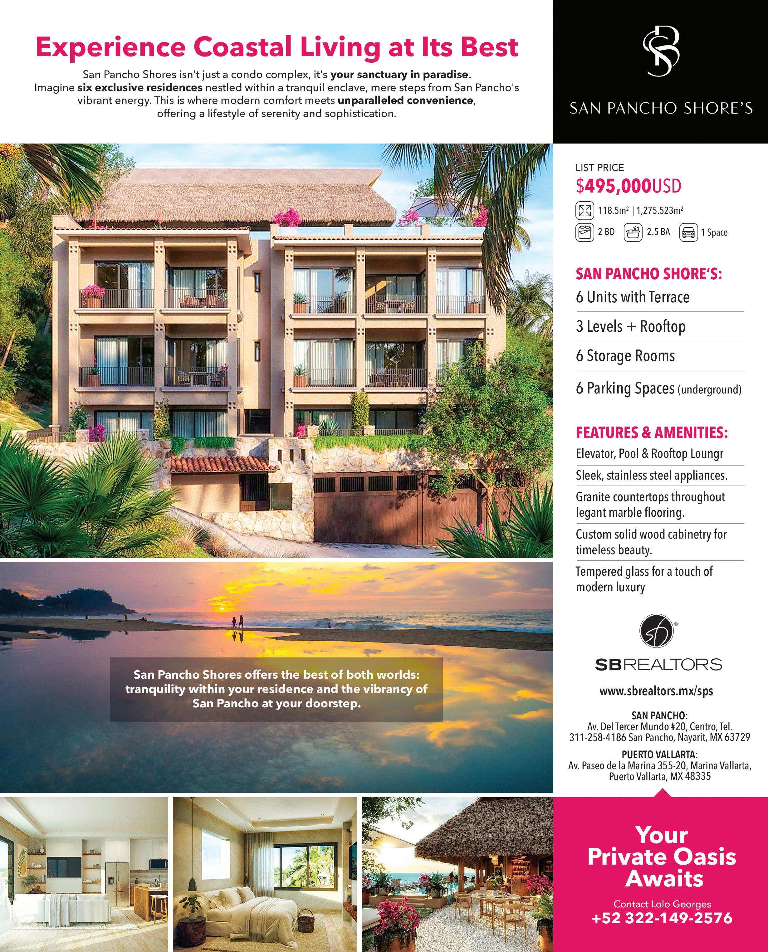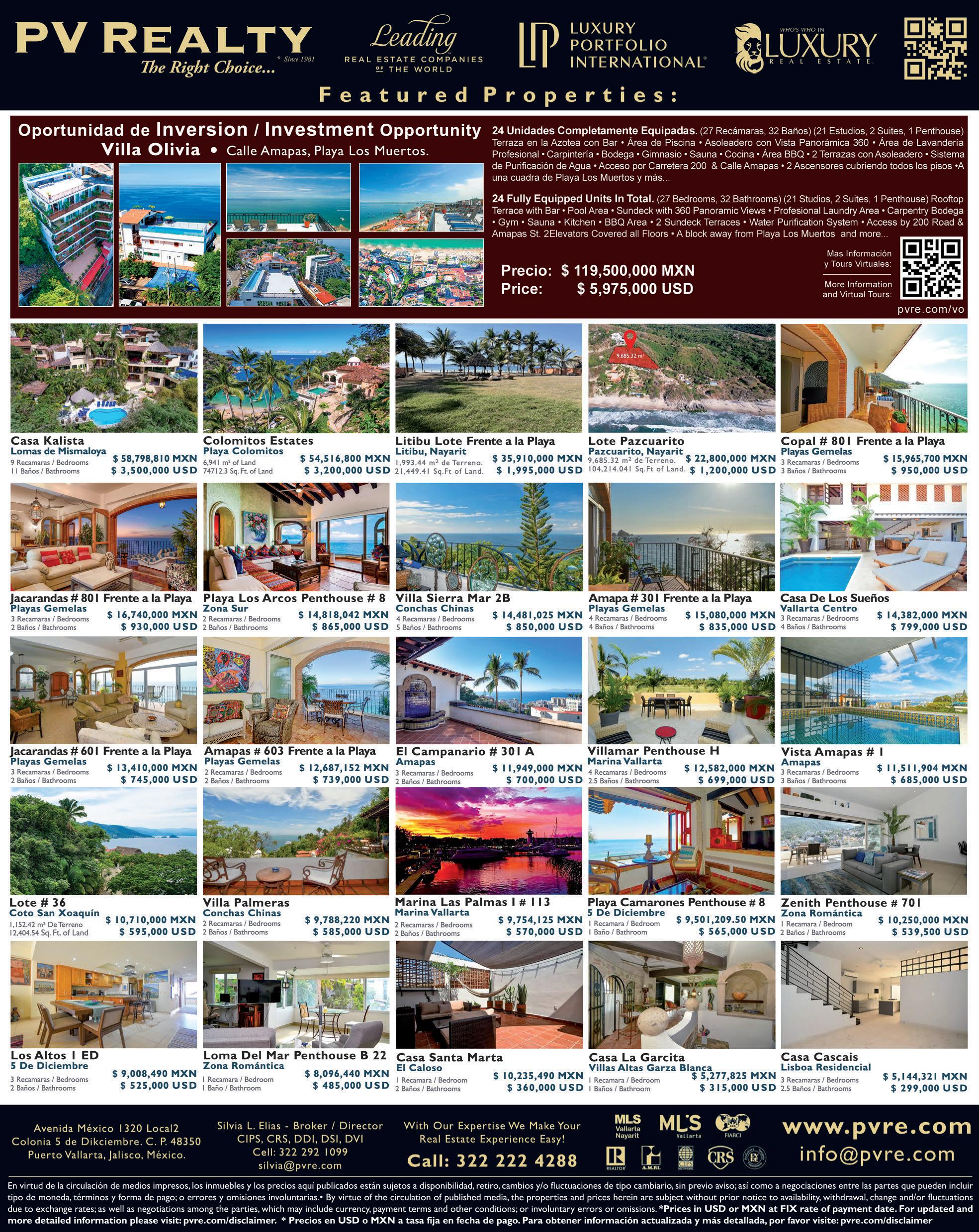 Vallarta Real Estate Guide Año 24 No. 7 Edición número 268 Julio, 2024 es una publicación mensual de distribución gratuita tiraje 13,000 ejemplares. Editor Responsable: Luis Rodolfo Mendoza Lozoya. Número de Certificado de Reserva otorgado por el Instituto Nacional de Derecho de Autor: 04-2016-062211265200111. Número de Certificado de Licitud de Título y Contenido: (en trámite). Domicilio de la Publicación: Valle de los Claveles 2504, Jardines del Valle, Zapopan, Jalisco, México, C.P. 45138. Teléfono: 322-221-0106. Imprenta: Imprenta Comercial El Debate, Blvd. Jesús Kumate Sur 4822, Ejido Las Flores, C.P. 80104, Culiacán, Sinaloa. Distribuidor: Vallarta Lifestyles Grupo Editorial S. de R.L. de C.V. Domicilio: Valle de los Claveles 2504, Jardines del Valle, Zapopan, Jalisco, México, C.P. 45138. Teléfono: 322-221-0106. Vallarta Lifestyles Grupo Editorial S de RL de CV no asume responsabilidad alguna por información y/o fotografías proporcionadas por los anunciantes. Dicha información se asume como confiable de acuerdo a las fuentes de donde se obtiene. Se prohibe la reproducción total o parcial de esta publicación y sus contenidos sin el permiso expreso de Vallarta Lifestyles Grupo Editorial S de RL de CV.