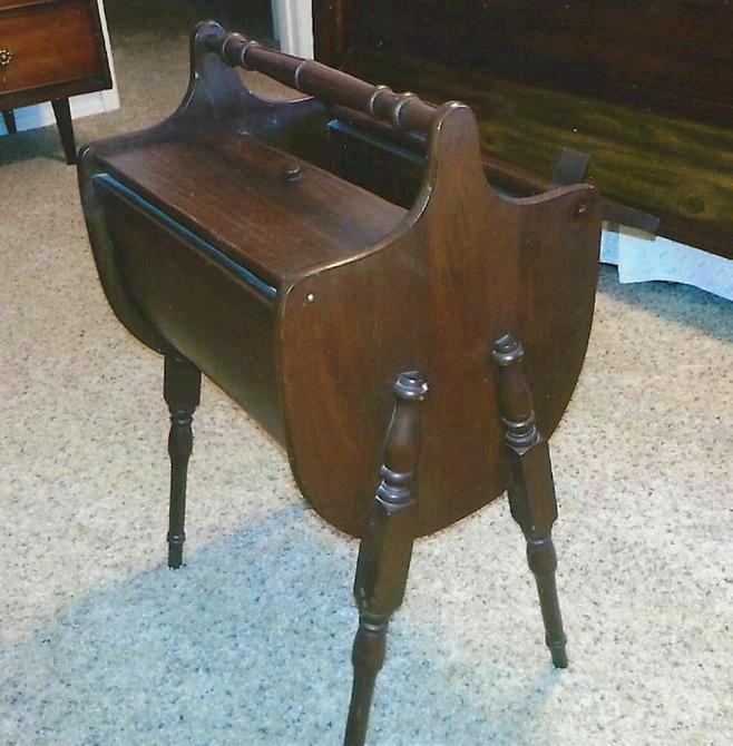 A: You have a wood sewing cabinet. Many were made in the early 1900s. They usually were made of wood, had handles for convenience, had turned legs and usually opened out to reveal shelves for storage. Seamstresses kept their sewing notions in the cabinets. They held threads, needles, scissors, tape measures, knitting and crocheting accessories. Sewing cabinets like yours were often placed next to a sewing chair or sewing rocker.