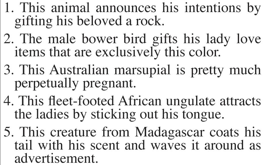 1. What long-necked bird attracts a mate by swinging his head in a figure 8?