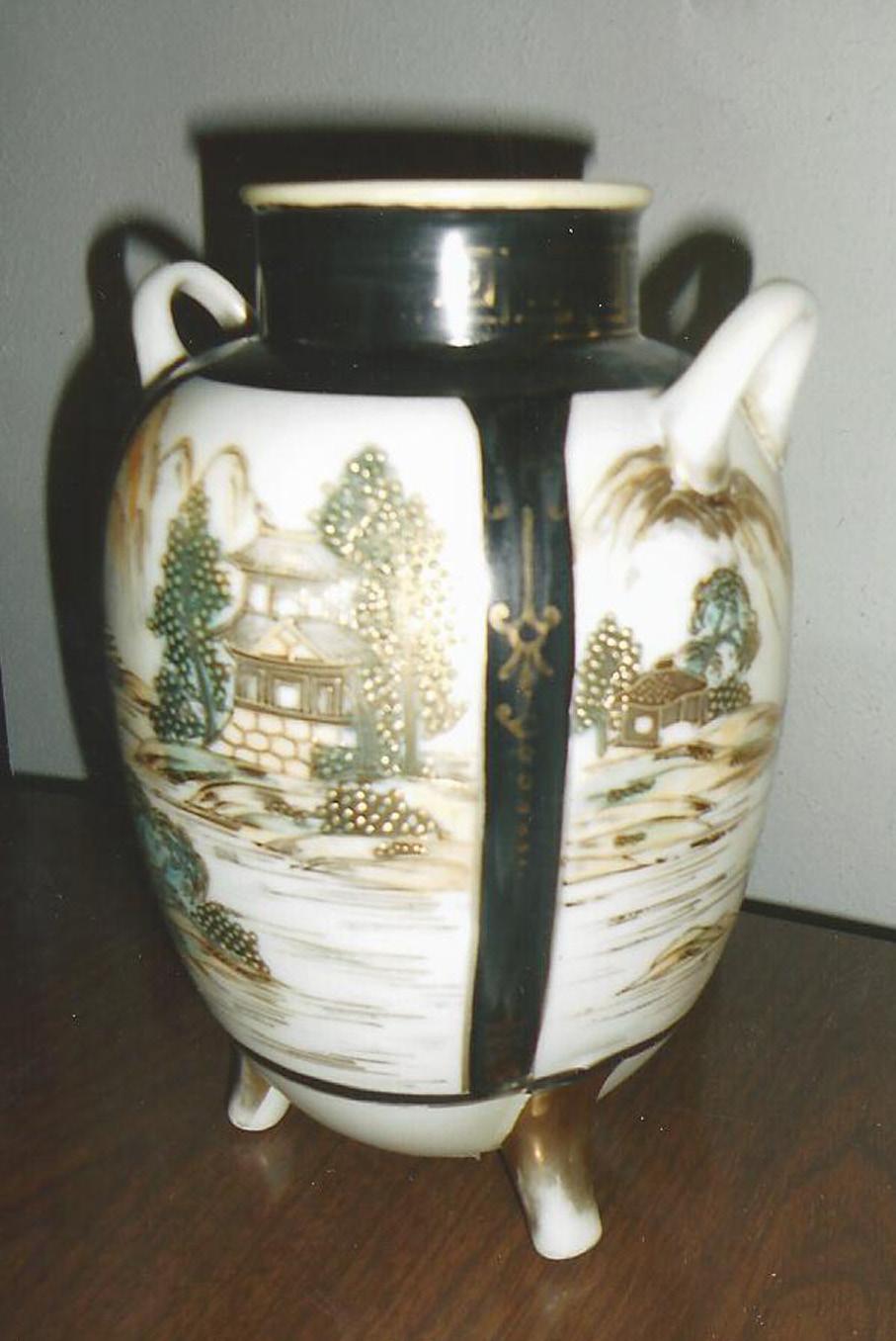 Q: I have enclosed a photo of a footed porcelain vase that I bought at an estate sale. It is approximately nine inches tall, has two handles and is decorated with Asian scenes of pagodas and trees. The trees are embellished with gold dots, and there is a gold band around the top. On the bottom is a wreath with the letter “M” in the center. Outside the wreath are the words “Hand Painted -- Nippon.”