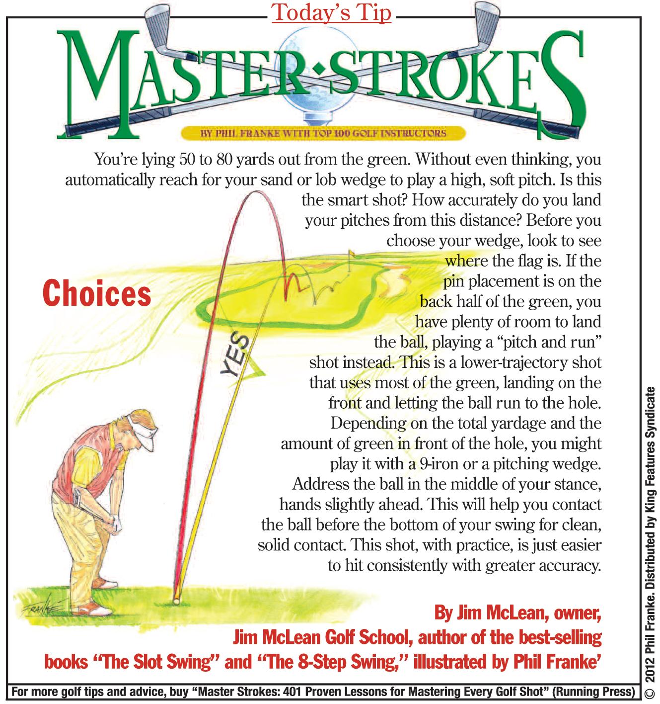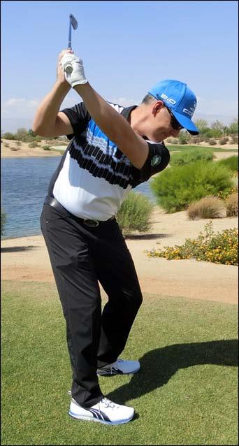 The left shoulder can turn to a point where you may feel it under your chin. By rehearsing swings to the top position, you can determine if you’ve made a large enough turn by feeling the shoulder move under the chin. Allow your head to even swivel slightly for a larger turn. Normally, golfers make considerably shorter turns than any rehearsal position, so use your practice as way to improve your body coil. Strive to make a shoulder turn of at least 80 plus degrees.