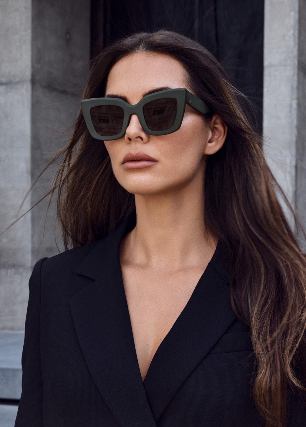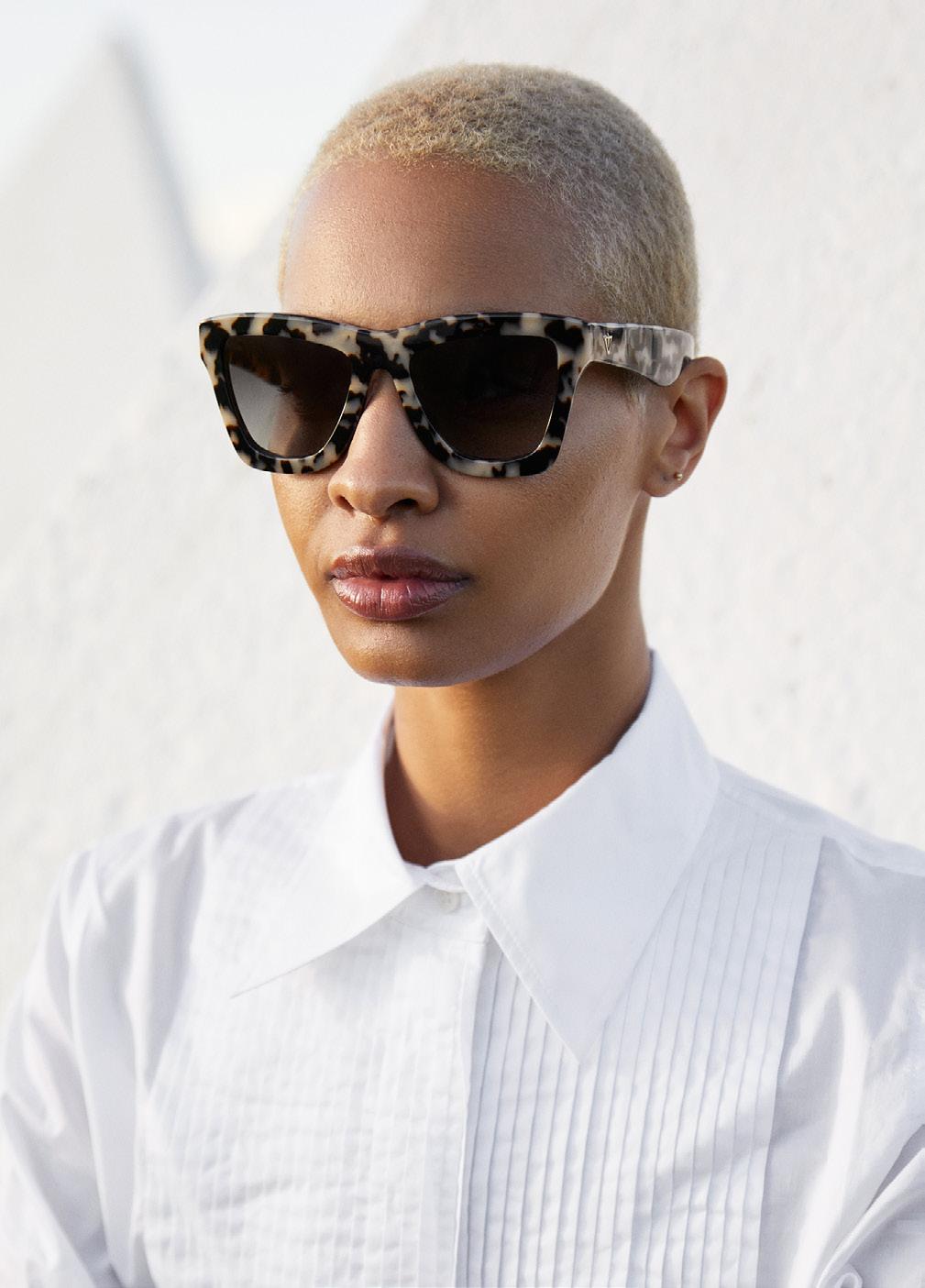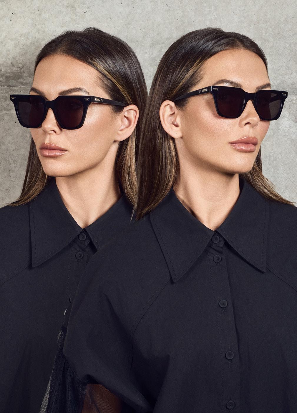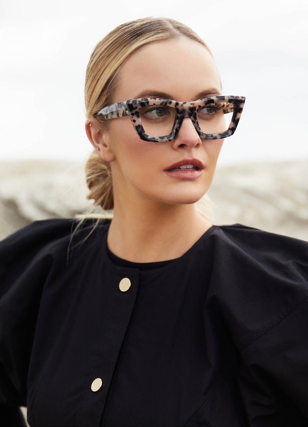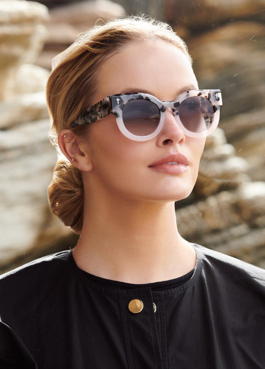 This fashion forward yet versatile style has quickly become one of our iconic shapes and is now available in our zero base (flat) face curve and zero base lenses. Our attention to detail and craftsmanship is heroed through the bevelled arm detail, premium Japanese acetate and metal cross inserts that have been inset with 14 Swarovski Crystals.