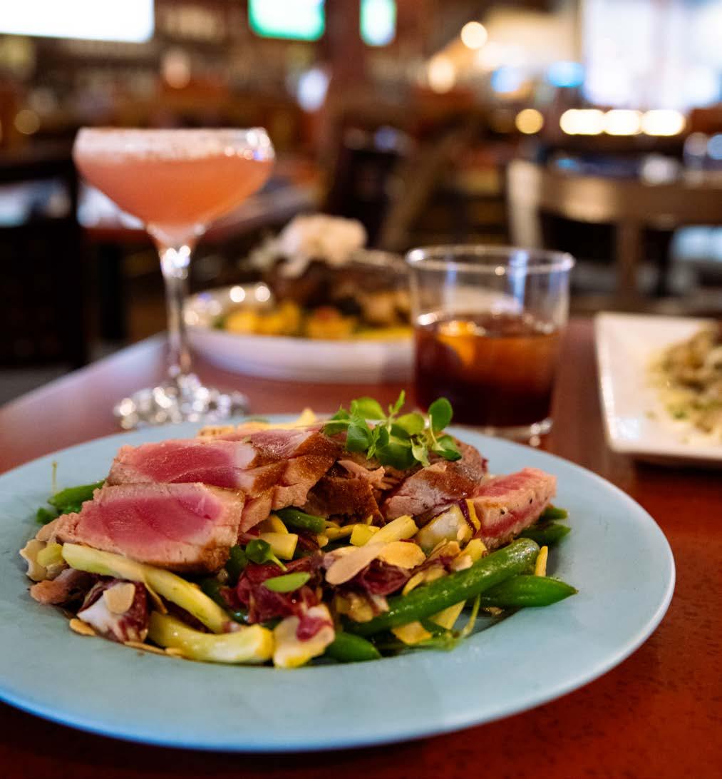 You might find warming entrées with rich sauces— such as bacon fat-poached salmon or coq au vin chicken wings with bacon, mushrooms and a Burgundy reduction—in winter; or an elevated tomato toast with ricotta, lemon zest and herbs in summer. The cheeseburger—a sirloin blend topped with a veil of elegantly draped Provolone and onions so caramelized they’re practically candy—is great year-round.