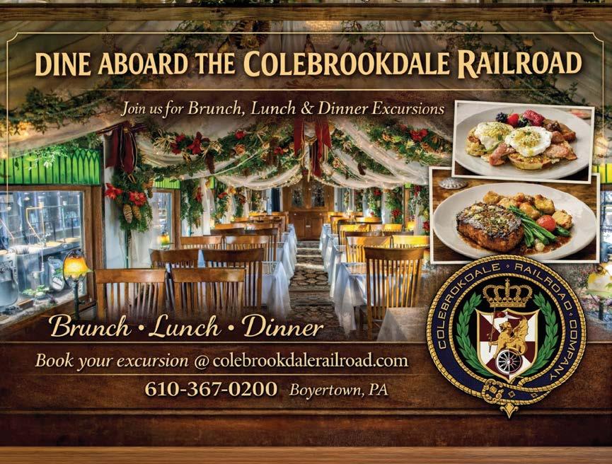 Picture an evening spent in an elaborately restored dining car, where chandeliers sway gently with the motion of the train and guests sip from elegant glasses as a thoughtfully prepared meal is served. In Montgomery County, you don’t have to imagine it. The Colebrookdale Railroad brings this experience to life. Guests can enjoy a variety of themed dining excursions, all served aboard ornate 1920s-inspired dining cars that meander through the scenic Secret Valley. Dinner on board Colebrookdale Railroad is part of the journey, blending romance, nostalgia and a slower pace of life reminiscent of days gone by. Seasonal offerings change throughout the year, from romantic Valentine’s dining experiences to fall foliage dinners.