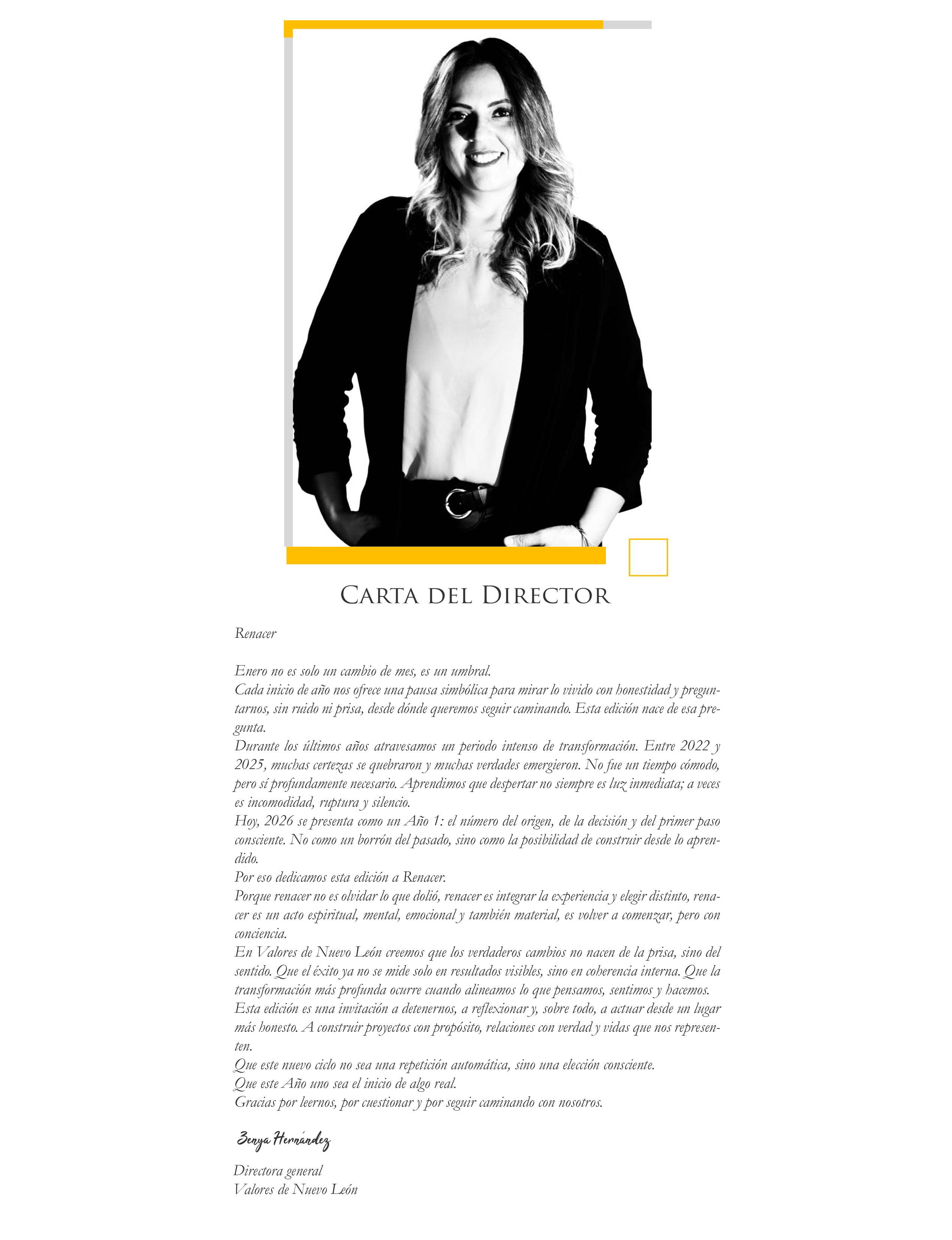 Valores de Nuevo León, revista mensual #162 Enero 2026. Editor Responsable: Zenyazhent Martha Esperanza Hernández Valladares. Número de Certificado de Reserva otorgado por el Instituto Nacional del Derecho de Autor: 04 - 2016 - 071413220700 - 102. Número de Certificado de Licitud de Título y Contenido: 16776. Domicilio de la Publicación: Álvaro Obregón 315, Colonia Centro C. P. 64000, Monterrey Nuevo León, México Imprenta: SAGA IMPRESOS. Privada Felipe Ángeles No. 3003 Col. Argentina C. P. 64550, Monterrey Nuevo León, México Distribuidor, Zenyazhent Martha Esperanza Hernández Valladares, Bosques de Linda Vista, Del Caporal 937 San Nicolás de los Garza, C.P.66473 Nuevo León, México.