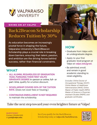Humble and curious servant leaders come to Valparaiso University to explore themselves, their calling, and their place in the world through a multifaceted journey of academic and spiritual awakening. Whether we are students in pursuit of our passions, faculty in the field earning hard-won wisdom, athletes on the starting block, or servant-leaders in real communities โ€” we cast compassion and bring truth to light, illuminating our surroundings and uncovering the joy thatโ€™s right before us all: the human joy found in service of something greater. Grounded, we shine. Grounded, we serve. Grounded, we radiate.
